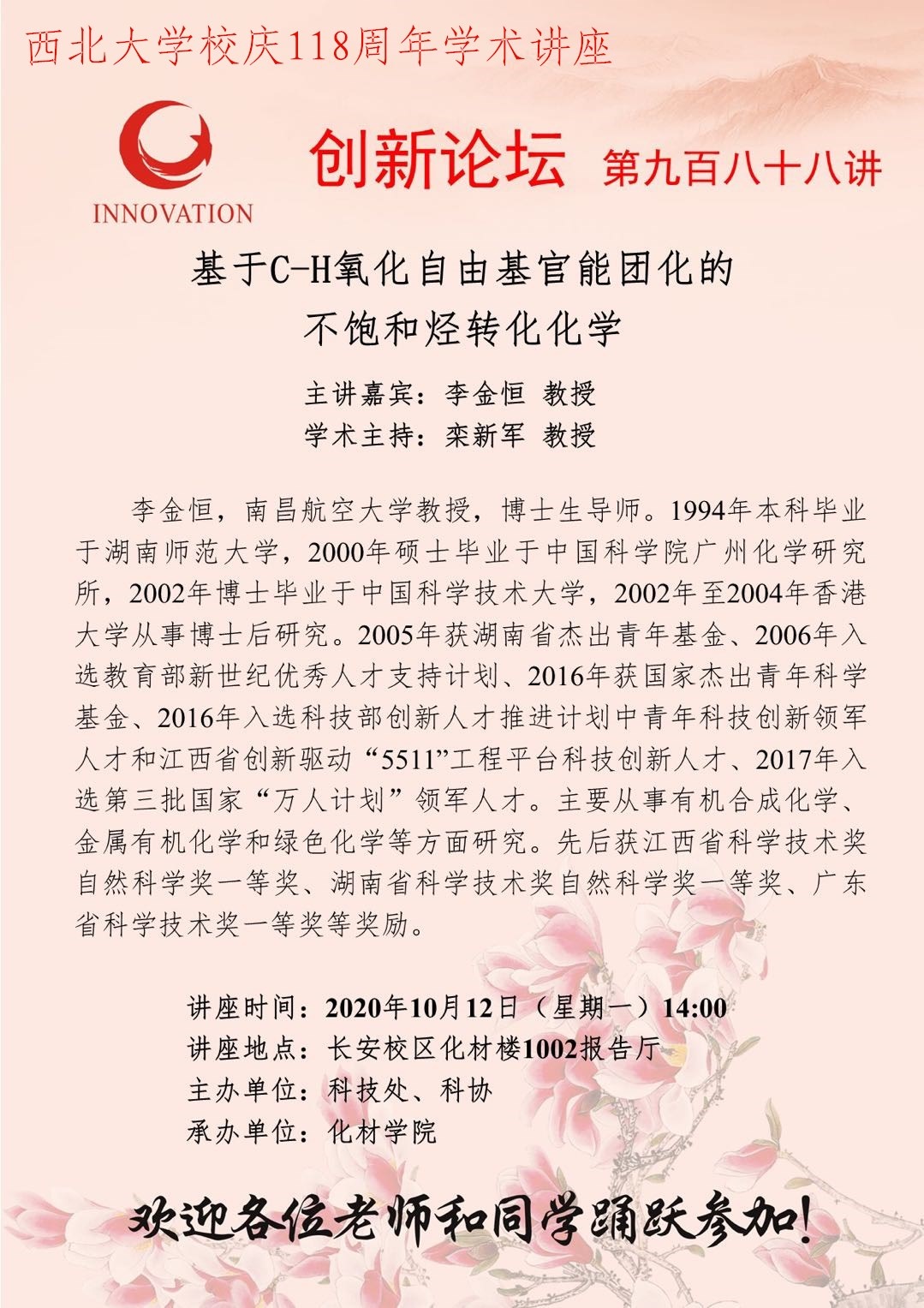 李金恒 教授 欧冠官方网站创新论坛第九百八十八讲暨校庆118周年学术讲座:基于C-H氧化自由基官能团化的不饱和烃转化化学 讲座时间 2020年10月12日(星期一)14:00 讲座地点 长安校区化材楼1002报告厅 讲座人介绍 李金恒 教授 讲座内容
