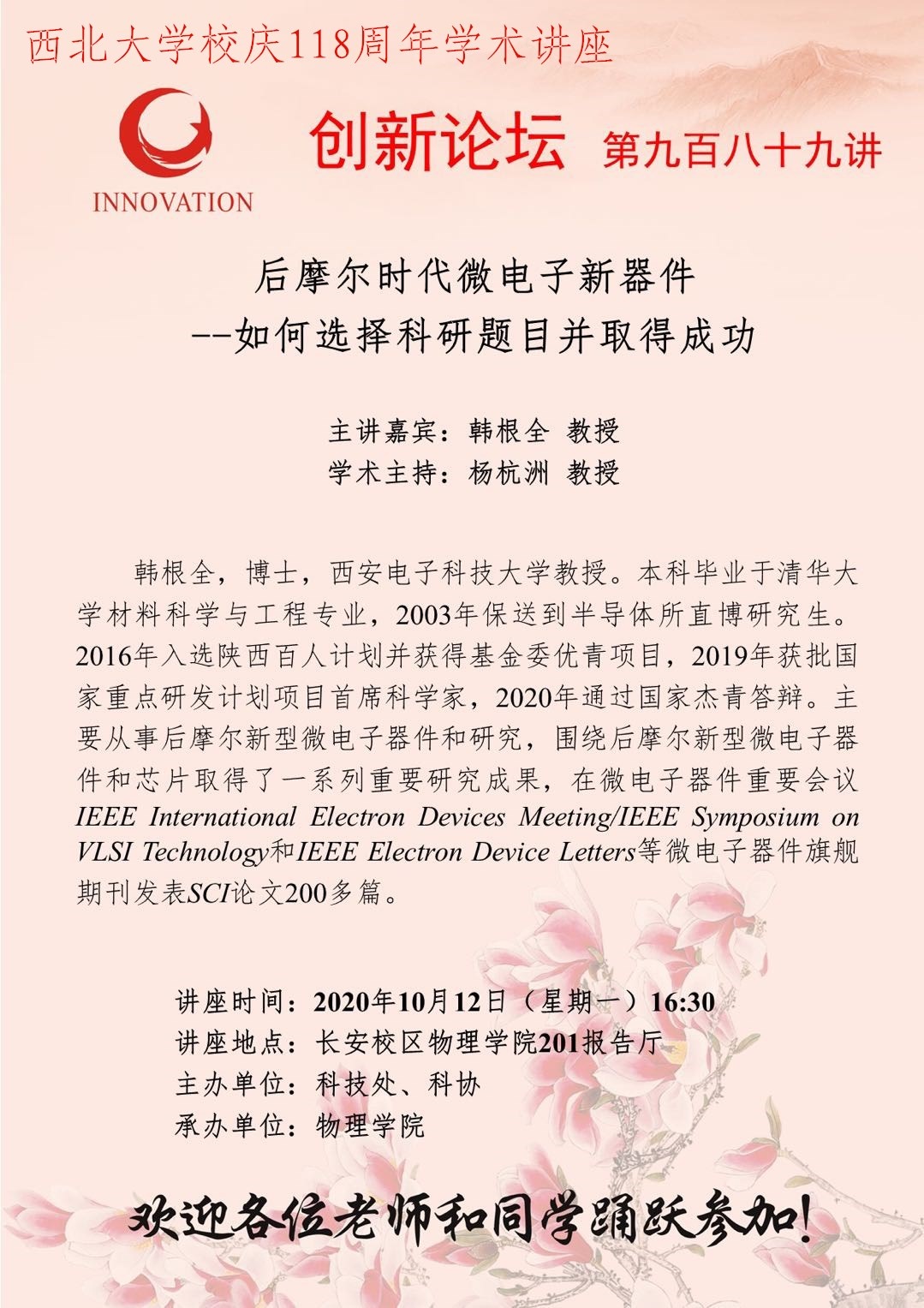 韩根全 教授 欧冠官方网站创新论坛第九百八十九讲暨校庆118周年学术讲座:后摩尔时代微电子新器件--如何选择科研题目并取得成功 讲座时间 2020年10月12日(星期一)16:30 讲座地点 长安校区物理学院201报告厅 讲座人介绍 韩根全 教授 讲座内容