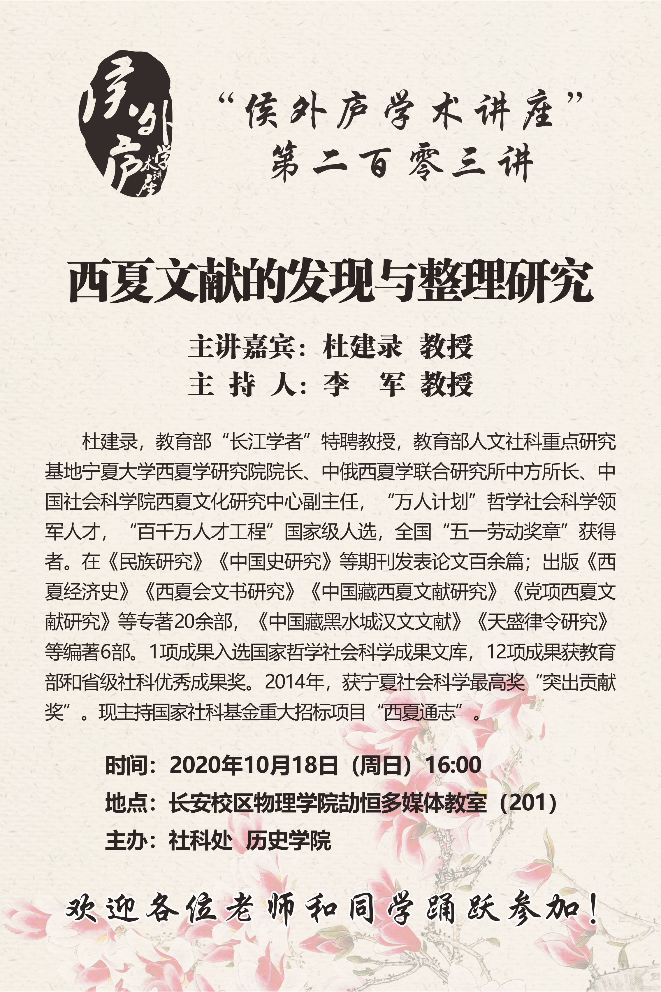 杜建录 教授 侯外庐学术讲座第二百零三讲:西夏文献的发现与整理研究 讲座时间 2020年10月18日(周日)16:00 讲座地点 长安校区物理学院劼恒多媒体教室(201) 讲座人介绍 杜建录 教授 讲座内容