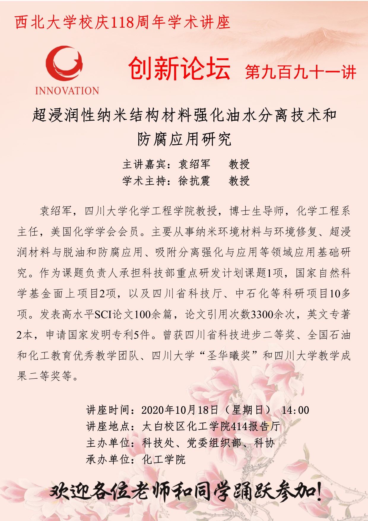袁绍军 教授 欧冠官方网站创新论坛第九百九十一讲暨校庆118周年学术讲座:超浸润性纳米结构材料强化油水分离技术和防腐应用研究 讲座时间 2020年10月18日(星期日)14:00 讲座地点 太白校区化工学院414报告厅 讲座人介绍 袁绍军 教授 讲座内容