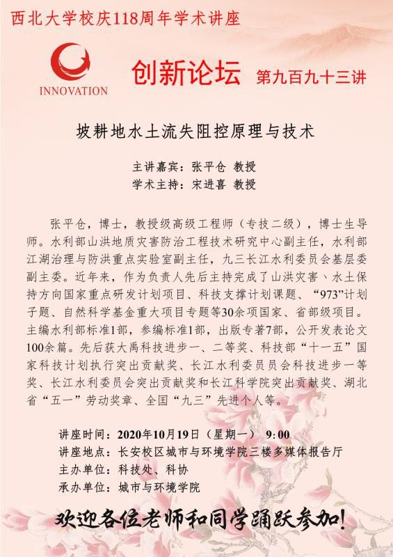 张平仓 教授 欧冠官方网站创新论坛第九百九十三讲暨校庆118周年学术讲座:坡耕地水土流失阻控原理与技术 讲座时间 2020年10月19日(星期一) 9:00 讲座地点 长安校区城市与环境学院三楼多媒体报告厅 讲座人介绍 张平仓 教授 讲座内容