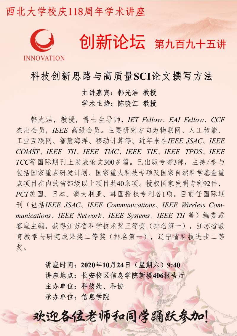 韩光洁 教授 欧冠官方网站创新论坛第九百九十五讲暨校庆118周年学术讲座:科技创新思路与高质量SCI论文撰写方法 讲座时间 2020年10月24日(星期六)9:40 讲座地点 长安校区信息学院新楼406报告厅 讲座人介绍 韩光洁 教授 讲座内容