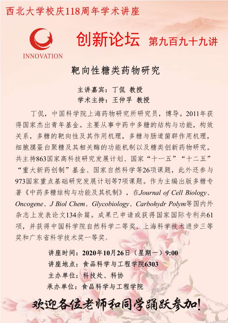 丁侃 教授 欧冠官方网站创新论坛第九百九十九讲暨校庆118周年学术讲座:靶向性糖类药物研究 讲座时间 2020年10月26日(星期一)9:00 讲座地点 食品科学与工程学院6303 讲座人介绍 丁侃 教授 讲座内容