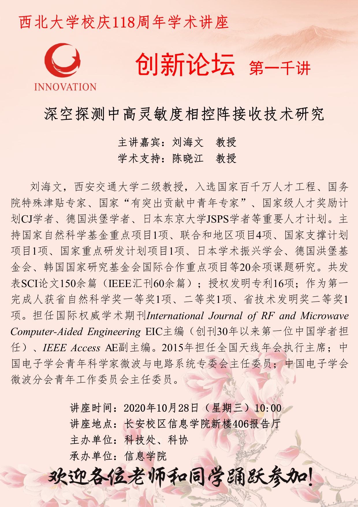 刘海文 教授 欧冠官方网站创新论坛第一千讲暨校庆118周年学术讲座:深空探测中高灵敏度相控阵接收技术研究 讲座时间 2020年10月28日(星期三)10:00 讲座地点 长安校区信息学院新楼406报告厅 讲座人介绍 刘海文 教授 讲座内容