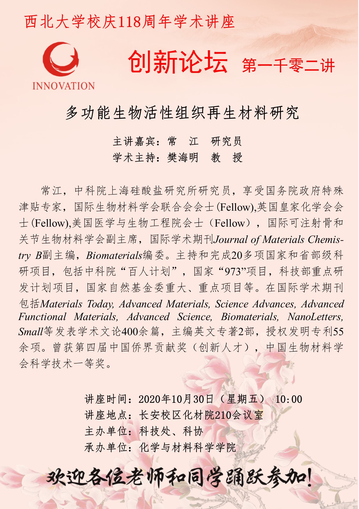 常江 研究员 欧冠官方网站创新论坛第一千零二讲暨校庆118周年学术讲座:多功能生物活性组织再生材料研究 讲座时间 2020年10月30日(星期五)10:00 讲座地点 化学与材料科学学院210室 讲座人介绍 常江 研究员 讲座内容