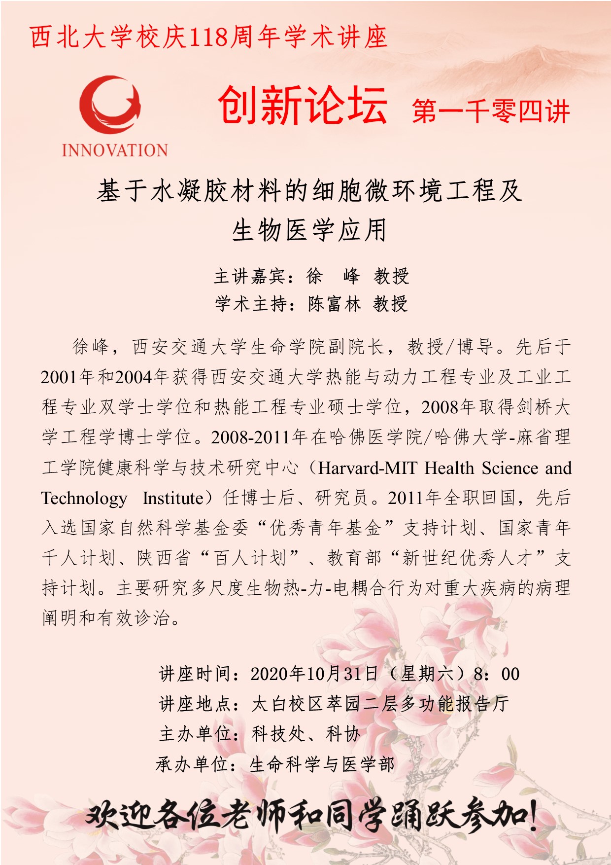 徐峰 教授 欧冠官方网站创新论坛第一千零四讲暨校庆118周年学术讲座:基于水凝胶材料的细胞微环境工程及生物医学应用 讲座时间 2020年10月31日(星期六)8:00 讲座地点 太白校区萃园二层多功能报告厅 讲座人介绍 徐峰 教授 讲座内容