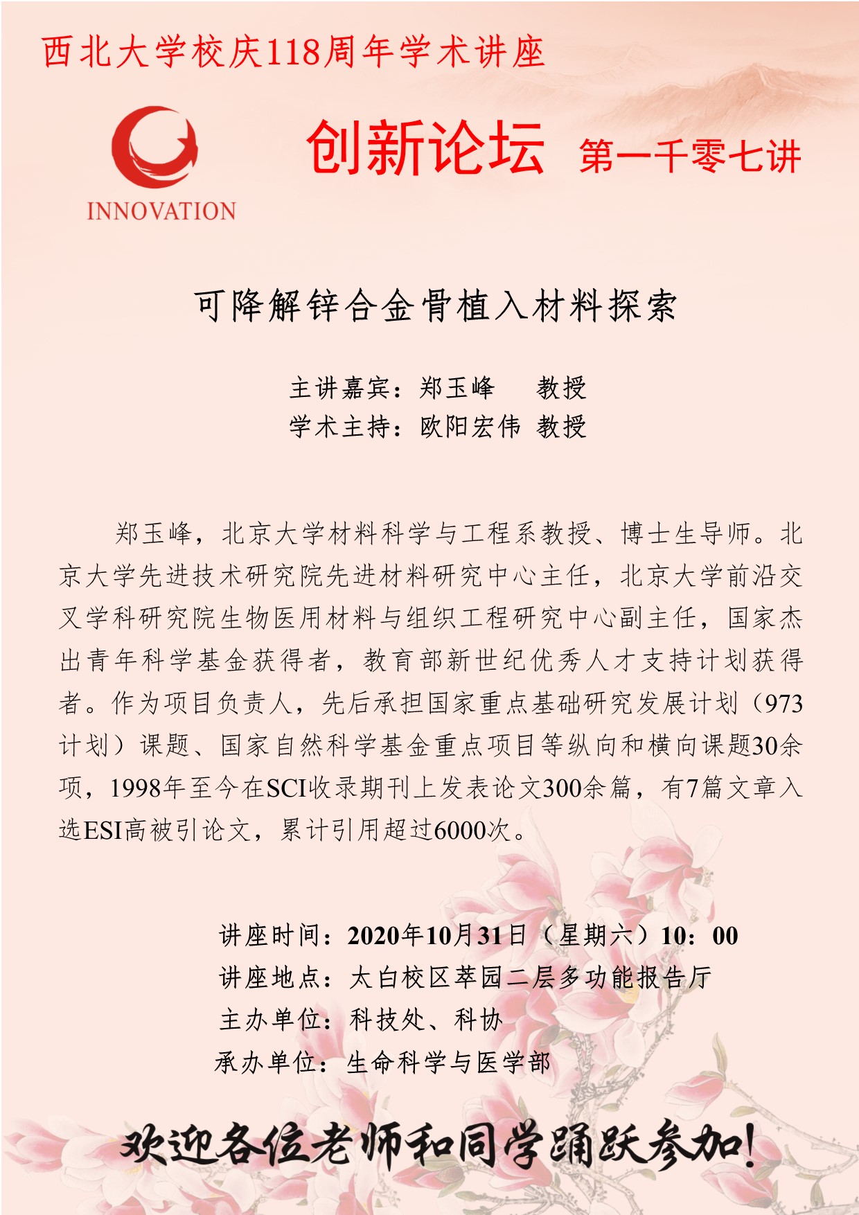 郑玉峰 教授 欧冠官方网站创新论坛第一千零七讲暨校庆118周年学术讲座:可降解锌合金骨植入材料探索 讲座时间 2020年10月31日(星期六)10:00 讲座地点 太白校区萃园二层多功能报告厅 讲座人介绍 郑玉峰 教授 讲座内容
