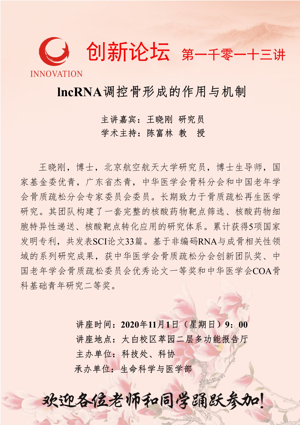 王晓刚 研究员 欧冠官方网站创新论坛第一千零一十三讲:lncRNA调控骨形成的作用与机制 讲座时间 2020年11月1日(星期日)9:00 讲座地点 太白校区萃园二层多功能报告厅 讲座人介绍 王晓刚 研究员 讲座内容