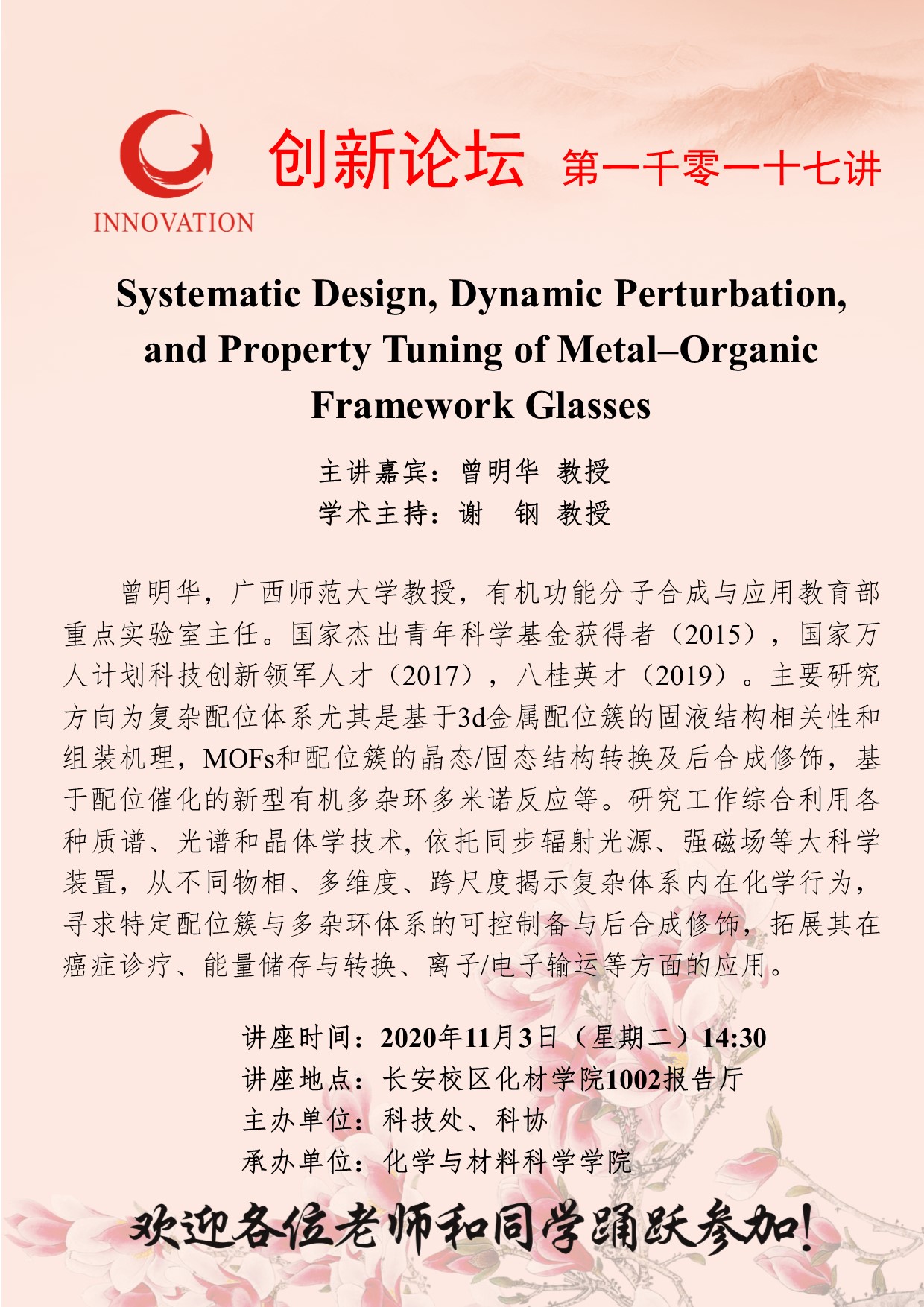 曾明华 教授 欧冠官方网站创新论坛第一千零一十七讲:Systematic Design, Dynamic Perturbation, and Property Tuning of Metal–Organic Framework Glasses 讲座时间 2020年11月3日(星期二)14:30 讲座地点 长安校区化材学院1002报告厅 讲座人介绍 曾明华 教授 讲座内容