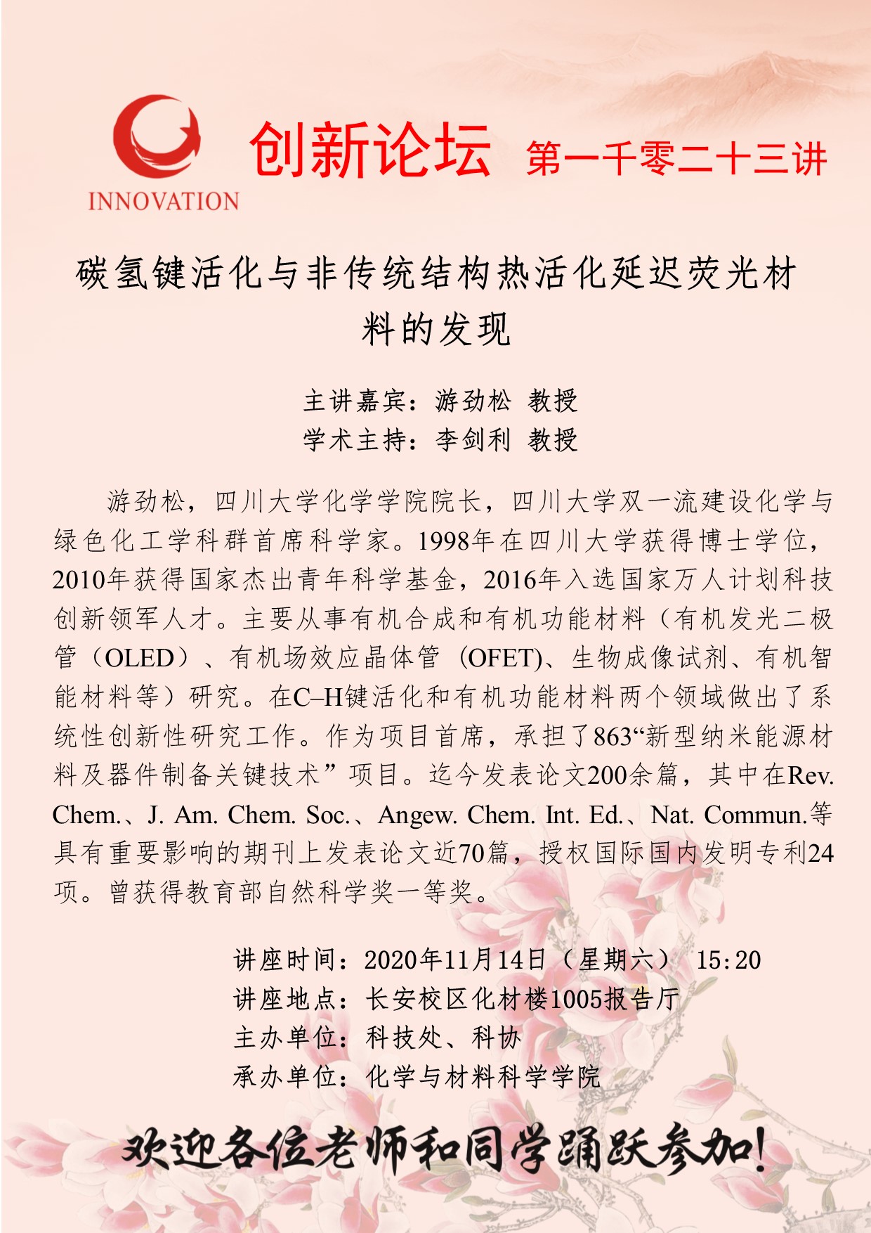 游劲松 教授 欧冠官方网站创新论坛第一千零二十三讲:碳氢键活化与非传统结构热活化延迟荧光材料的发现 讲座时间 2020年 11月14日(周六)15:20 讲座地点 长安校区化材楼1005报告厅 讲座人介绍 游劲松 教授 讲座内容
