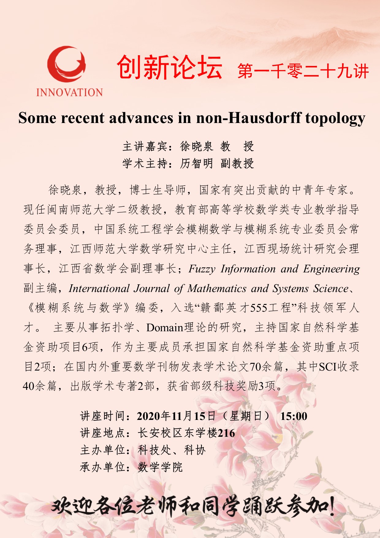 徐晓泉 教授 欧冠官方网站创新论坛第一千零二十九讲:Some recent advances in non-Hausdorff topology 讲座时间 2020年11月15日(星期日) 15:00 讲座地点 长安校区东学楼216 讲座人介绍 徐晓泉 教授 讲座内容