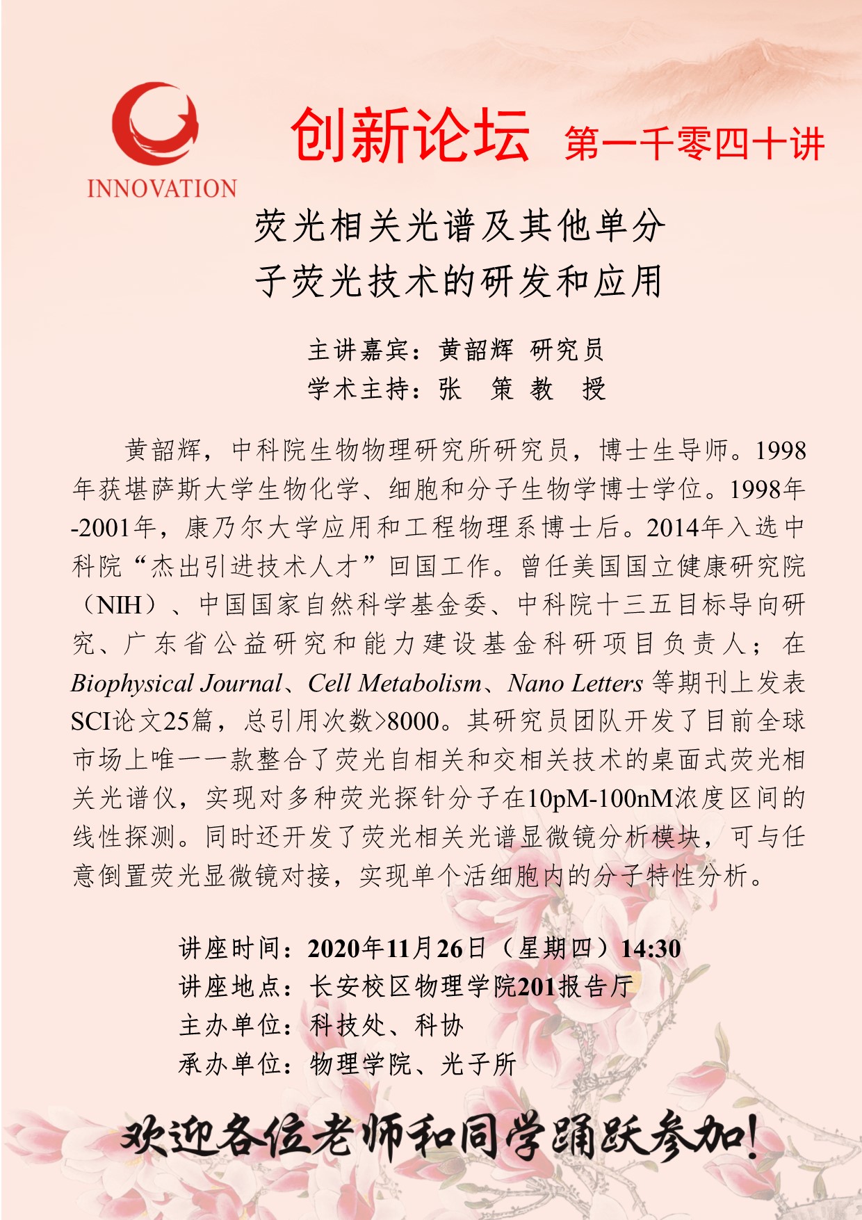 黄韶辉 研究员 欧冠官方网站创新论坛第一千零四十讲:荧光相关光谱及其他单分子荧光技术的研发和应用 讲座时间 2020年11月26日(星期四)14:30 讲座地点 长安校区物理学院201报告厅 讲座人介绍 黄韶辉 研究员 讲座内容