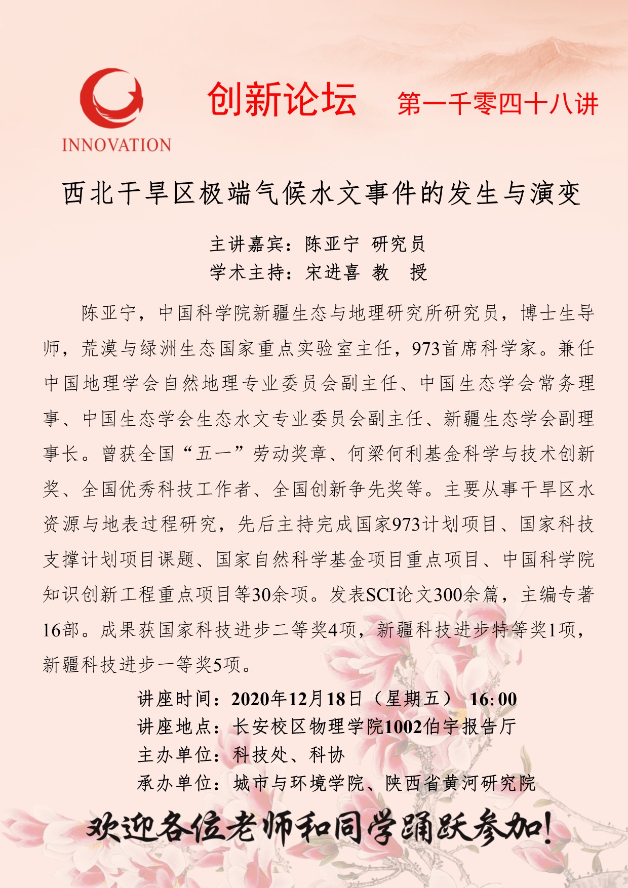 陈亚宁 研究员 欧冠官方网站创新论坛第一千零四十八讲:西北干旱区极端气候水文事件的发生与演变研究 讲座时间 2020年12月18日(星期五)16:00 讲座地点 长安校区物理楼伯宇报告厅 讲座人介绍 陈亚宁 研究员 讲座内容