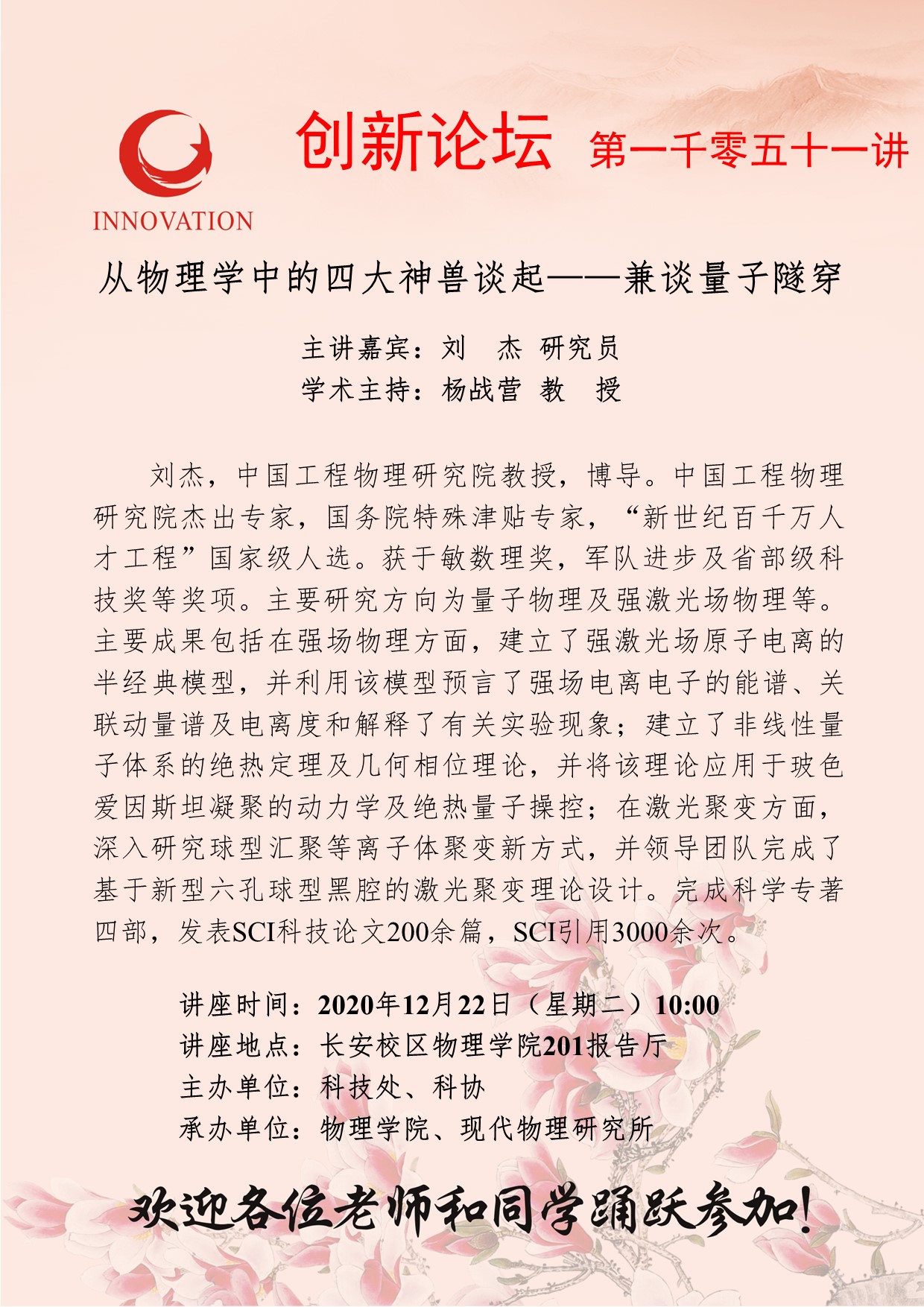 刘 杰 研究员 欧冠官方网站创新论坛第一千零五十一讲:从物理学中的四大神兽谈起——兼谈量子隧穿 讲座时间 2020年12月22日(星期二)10:00 讲座地点 长安校区物理学院201报告厅 讲座人介绍 刘 杰 研究员 讲座内容