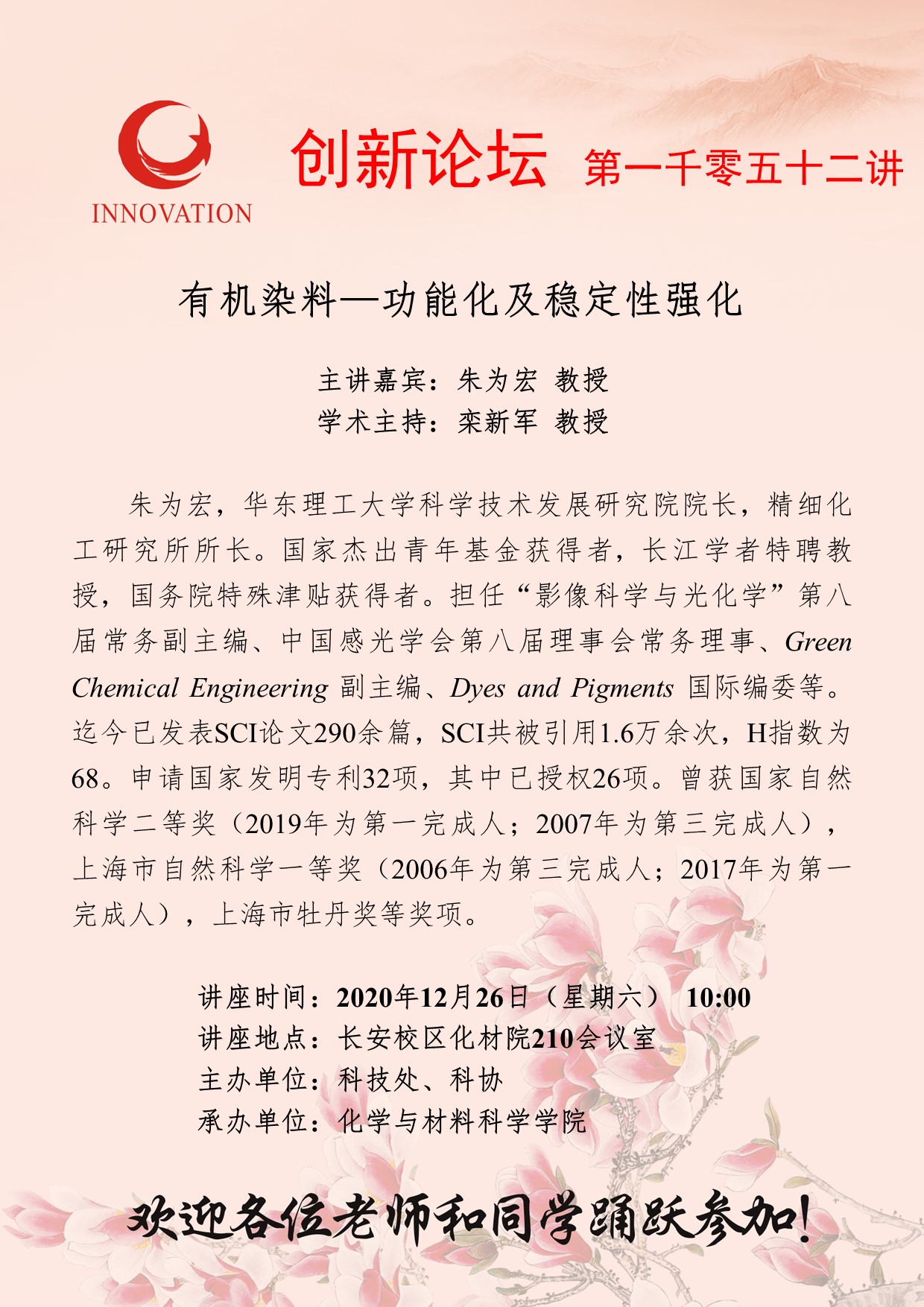 朱为宏 教授 欧冠官方网站创新论坛第一千零五十二讲: 有机染料—功能化及稳定性强化 讲座时间 2020年12月26日(星期六) 10:00 讲座地点 长安校区化材院210会议室 讲座人介绍 朱为宏 教授 讲座内容