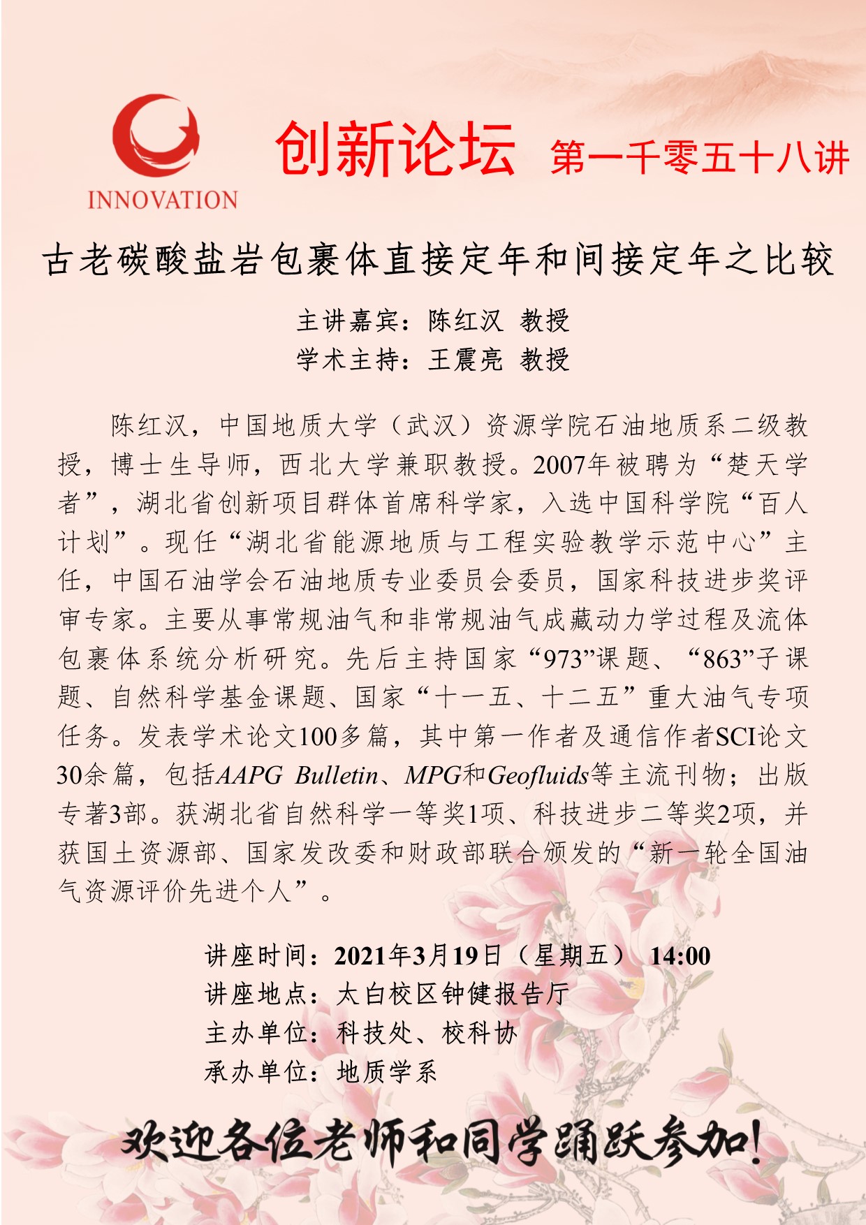 陈红汉 教授 欧冠官方网站创新论坛第一千零五十八讲:古老碳酸盐岩包裹体直接定年和间接定年之比较 讲座时间 2021年3月19日(星期五) 14:00 讲座地点 太白校区钟健报告厅 讲座人介绍 陈红汉 教授 讲座内容