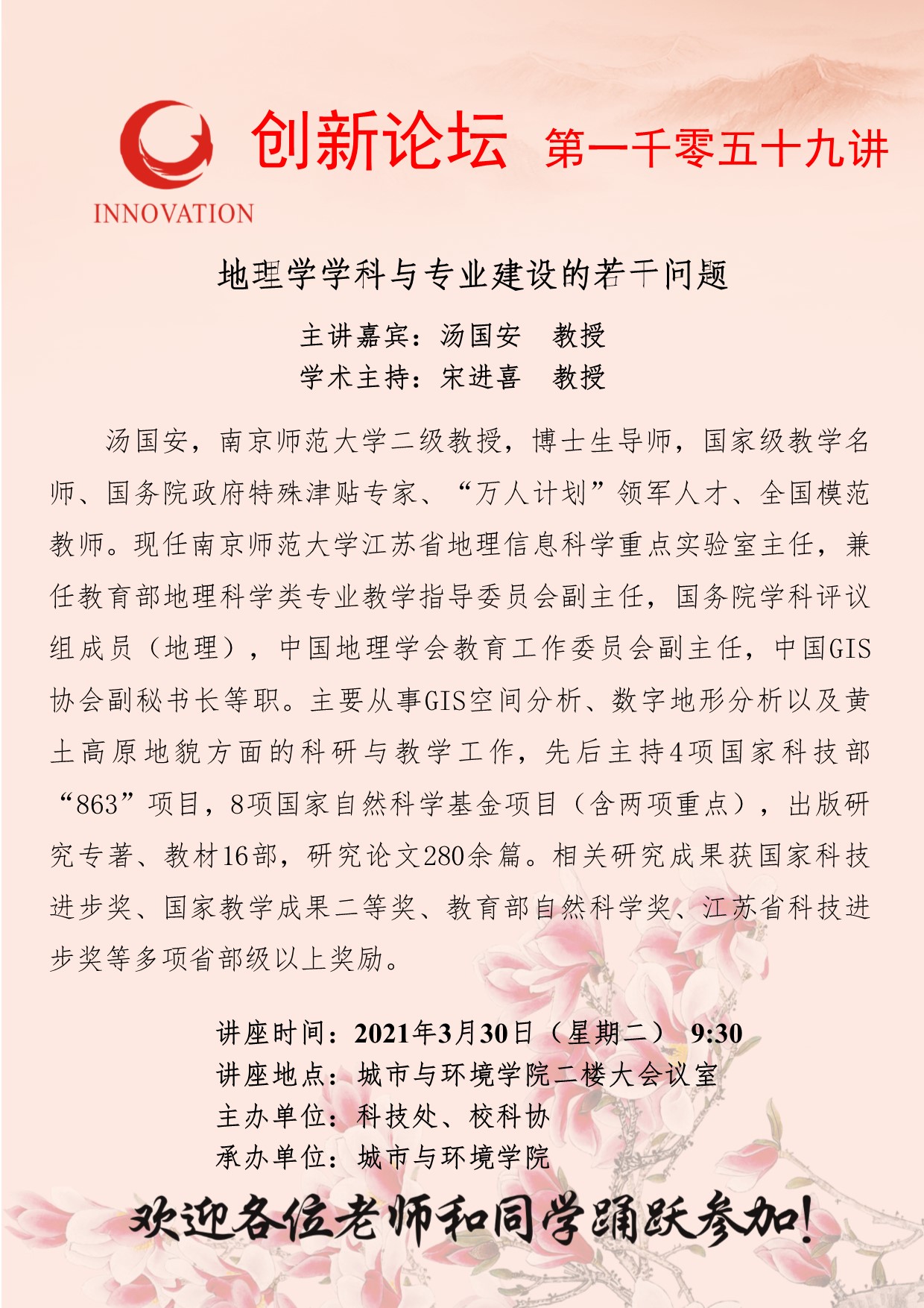 汤国安 教授 欧冠官方网站创新论坛第一千零五十九讲:地理学学科与专业建设的若干问题 讲座时间 2021年3月30日(星期二) 9:30 讲座地点 城市与环境学院二楼大会议室 讲座人介绍 汤国安 教授 讲座内容