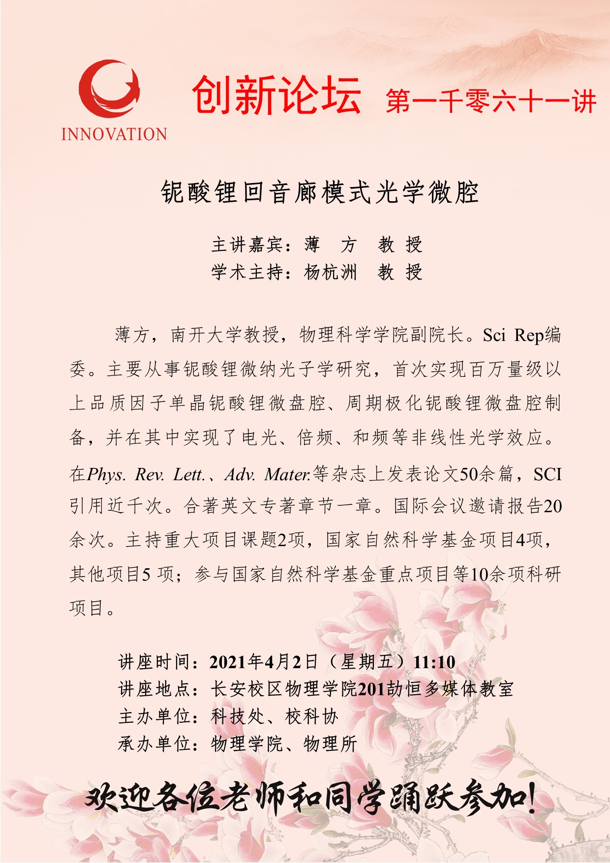 薄 方 教 授 欧冠官方网站创新论坛第一千零六十一讲:铌酸锂回音廊模式光学微腔 讲座时间 2021年4月2日(星期五)11:10 讲座地点 长安校区物理学院201劼恒多媒体教室 讲座人介绍 薄 方 教 授 讲座内容