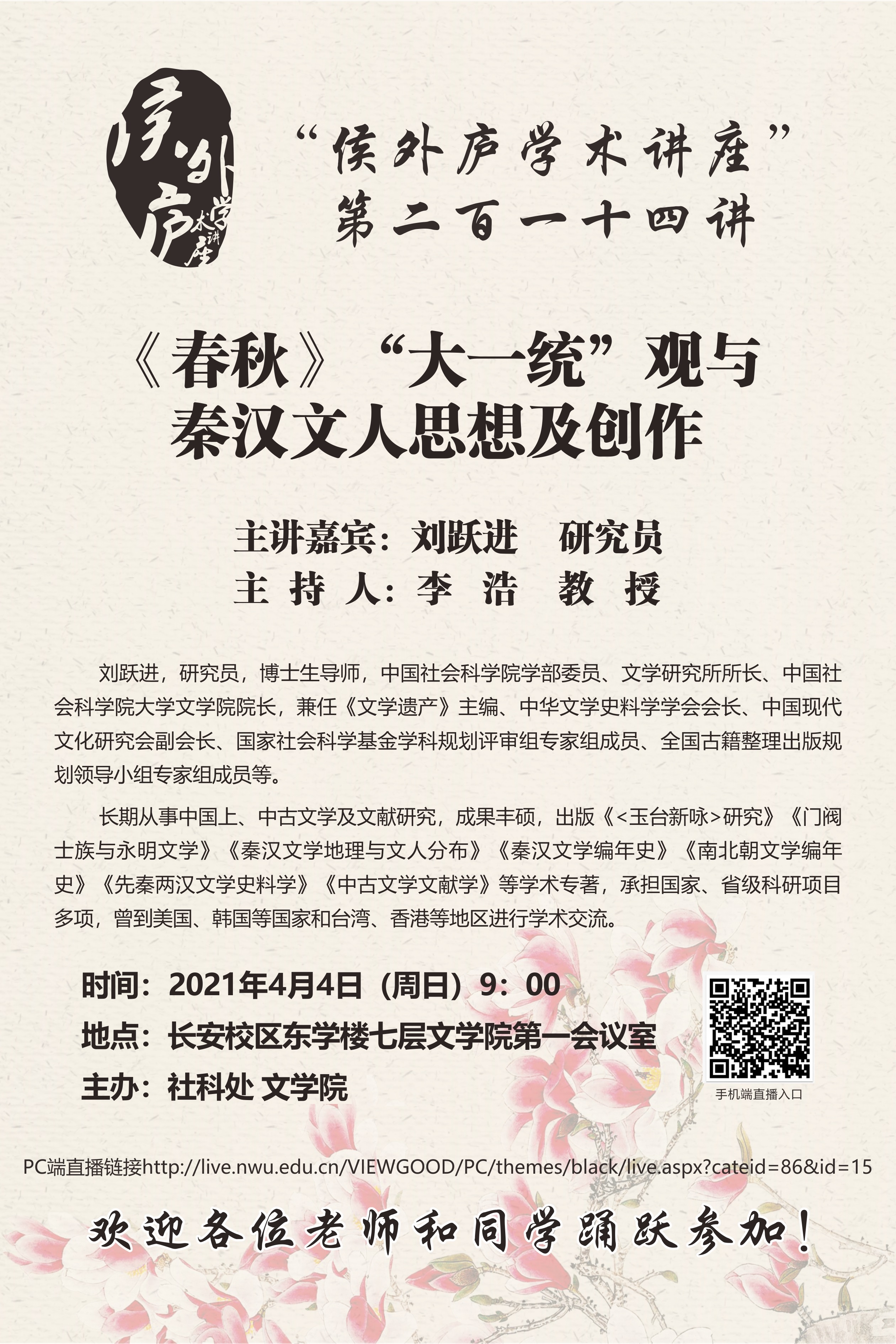 侯外庐学术讲座第二百一十四讲:《春秋》“大一统”观与秦汉文人思想及创作