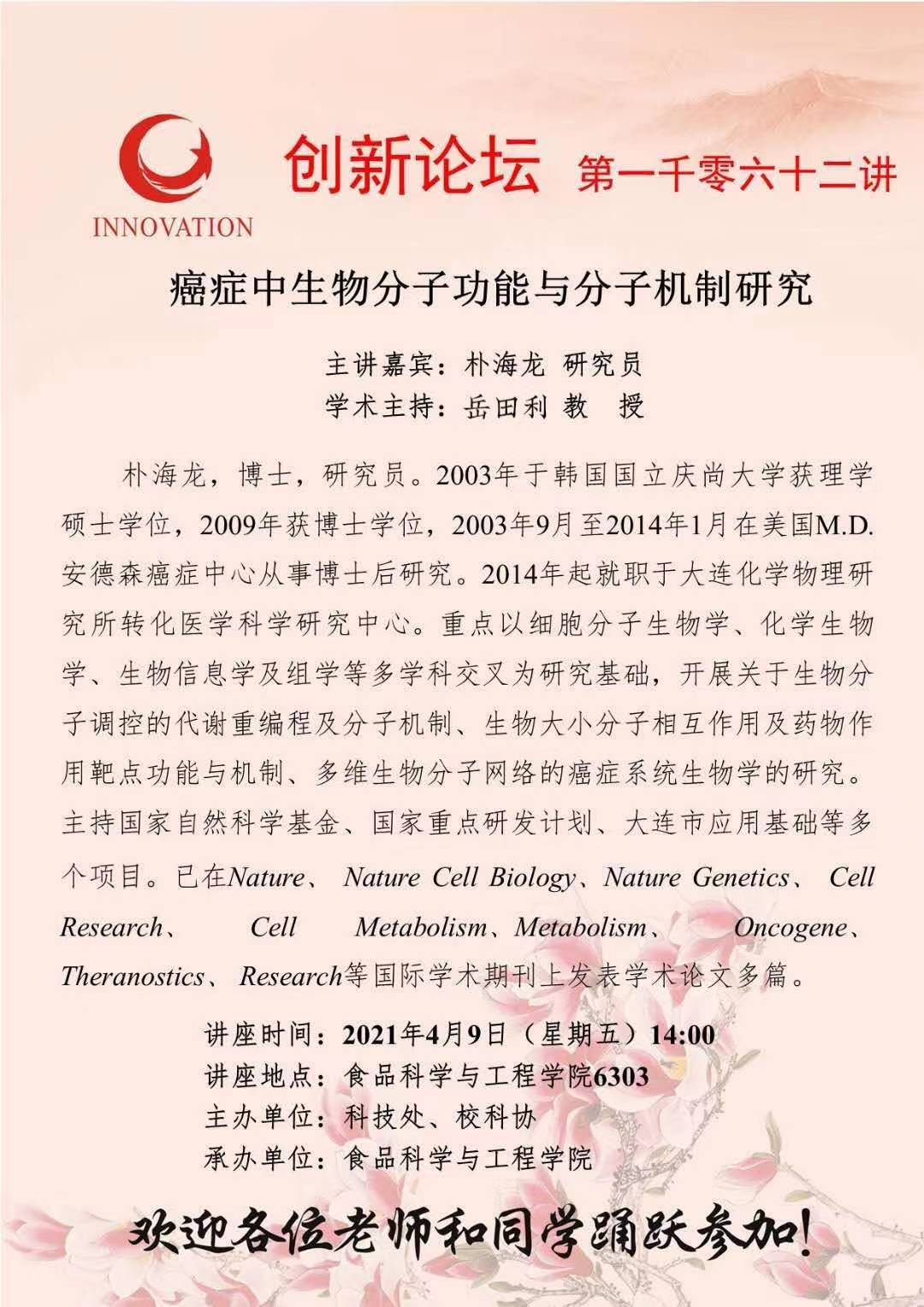 朴海龙 研究员 欧冠官方网站创新论坛第一千零六十二讲:癌症中生物分子功能与分子机制研究 讲座时间 2021年4月9日(星期五)14:00 讲座地点 食品科学与工程学院6303 讲座人介绍 朴海龙 研究员 讲座内容