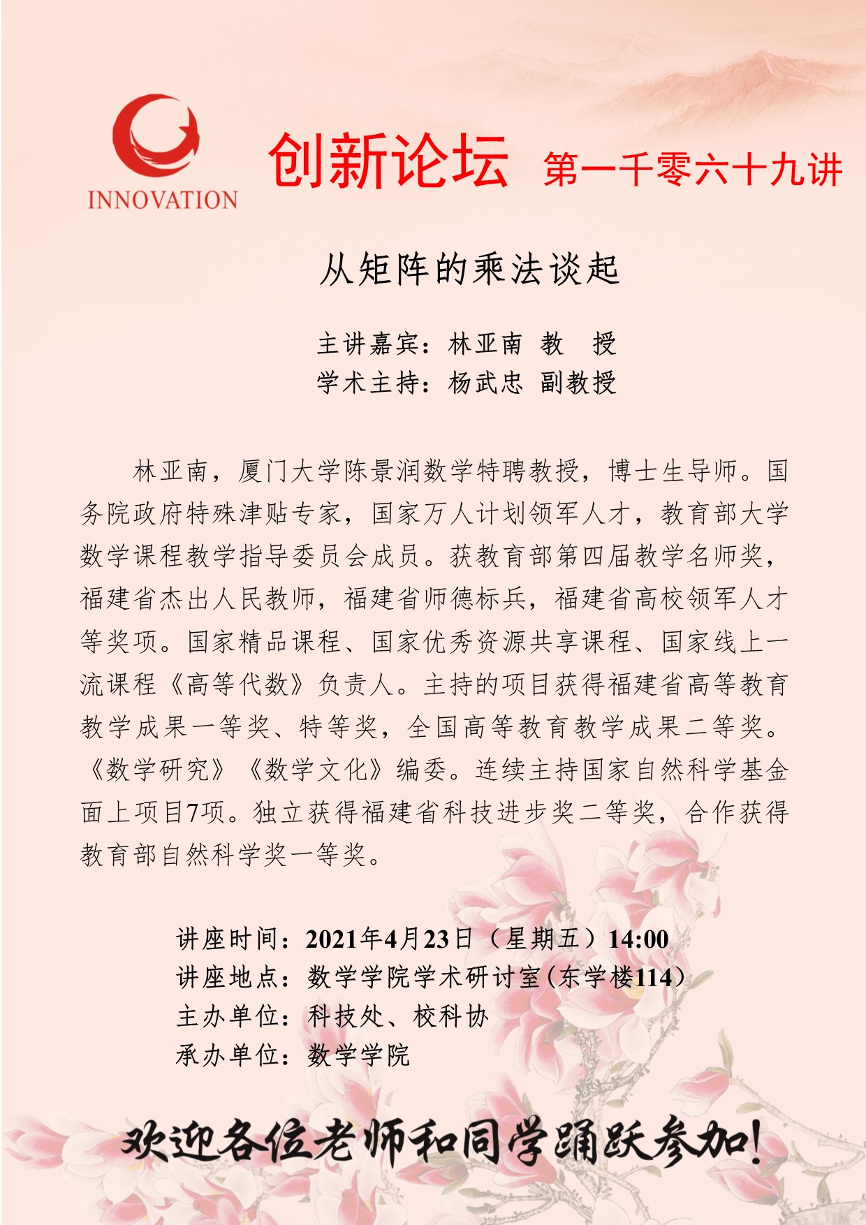 林亚南 教授 欧冠官方网站创新论坛第一千零六十九讲:从矩阵的乘法谈起 讲座时间 2021年4月23日(星期五)14:00 讲座地点 数学学院学术研讨室(东学楼114) 讲座人介绍 林亚南 教授 讲座内容