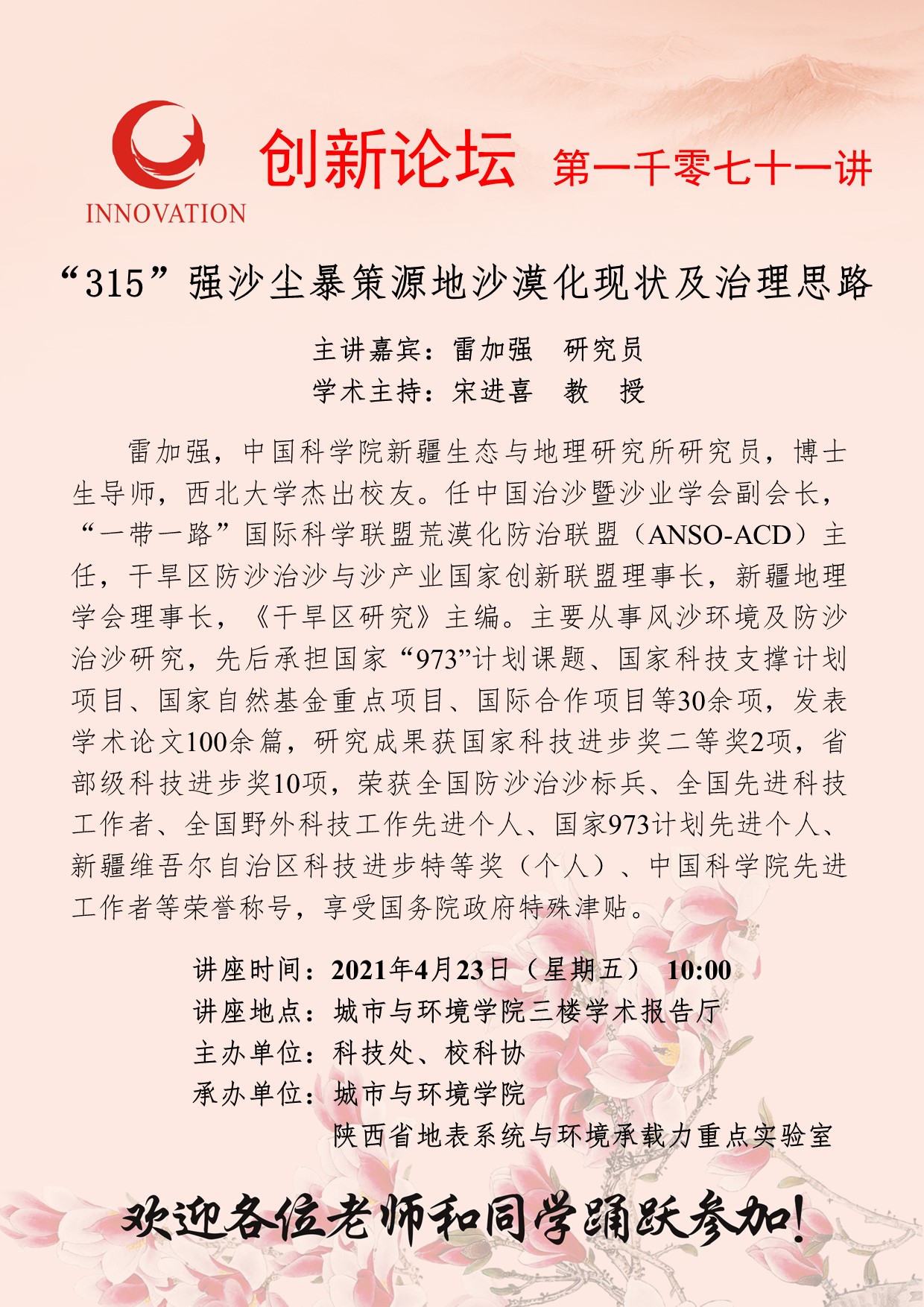 雷加强 研究员 欧冠官方网站创新论坛第一千零七十一讲:“315”强沙尘暴策源地沙漠化现状及治理思路 讲座时间 2021年4月23日(星期五) 10:00 讲座地点 城市与环境学院三楼学术报告厅 讲座人介绍 雷加强 研究员 讲座内容