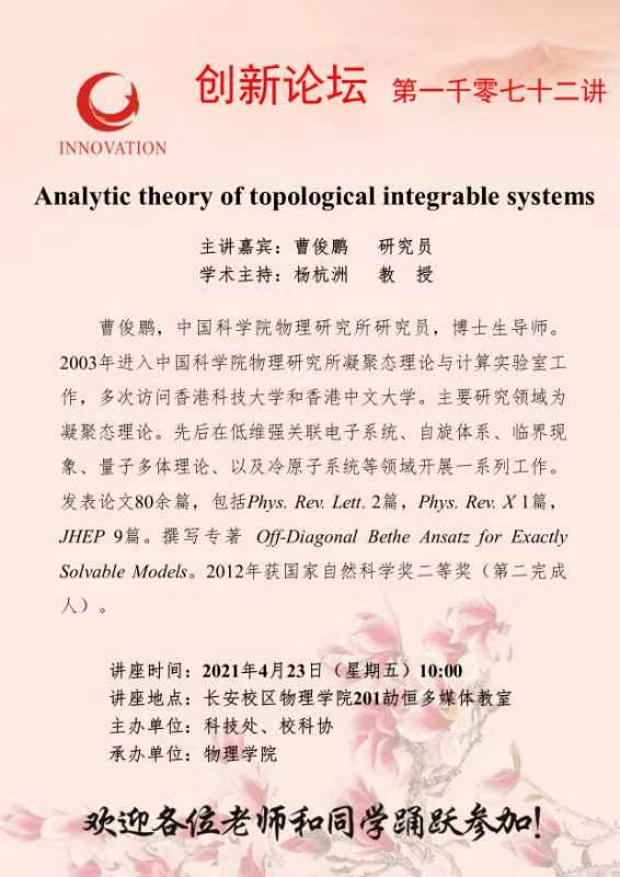 曹俊鹏 研究员 欧冠官方网站创新论坛第一千零七十二讲:Analytic theory of topological integrable systems 讲座时间 2021年4月23日(星期五)10:00 讲座地点 长安校区物理学院201劼恒多媒体教室 讲座人介绍 曹俊鹏 研究员 讲座内容