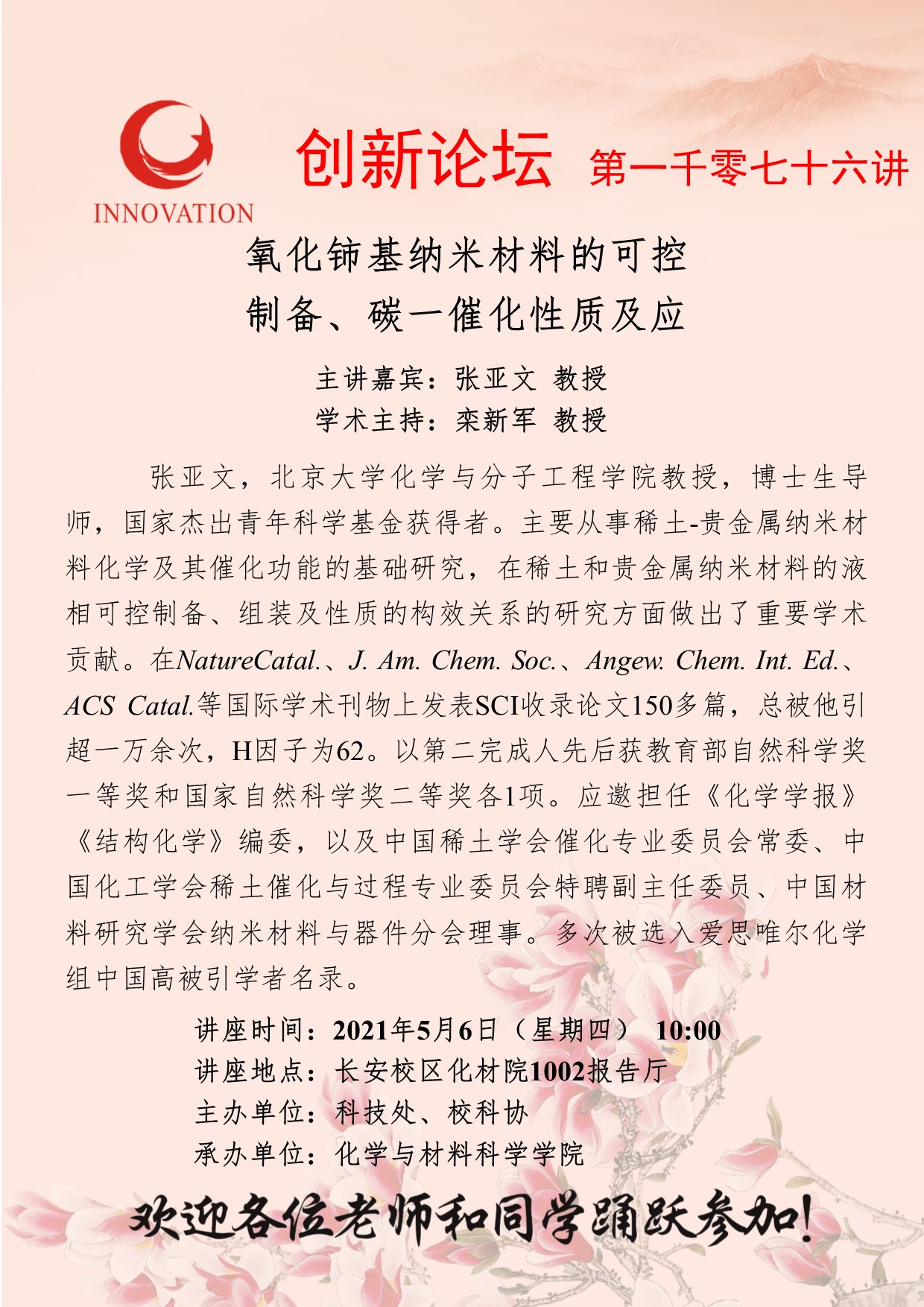 张亚文 教授 欧冠官方网站创新论坛第一千零七十六讲:氧化铈基纳米材料的可控制备、碳一催化性质及应用 讲座时间 2021年5月6日(星期四) 10:00 讲座地点 长安校区化材院1002报告厅 讲座人介绍 张亚文 教授 讲座内容