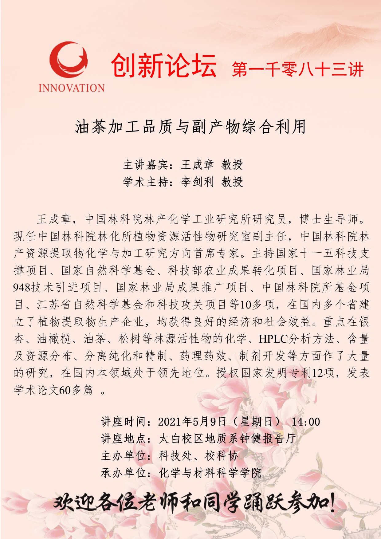 王成章 教授 欧冠官方网站创新论坛第一千零八十三讲:油茶加工品质与副产物综合利用 讲座时间 2021年5月9日(星期日) 14:00 讲座地点 太白校区地质系钟健报告厅 讲座人介绍 王成章 教授 讲座内容
