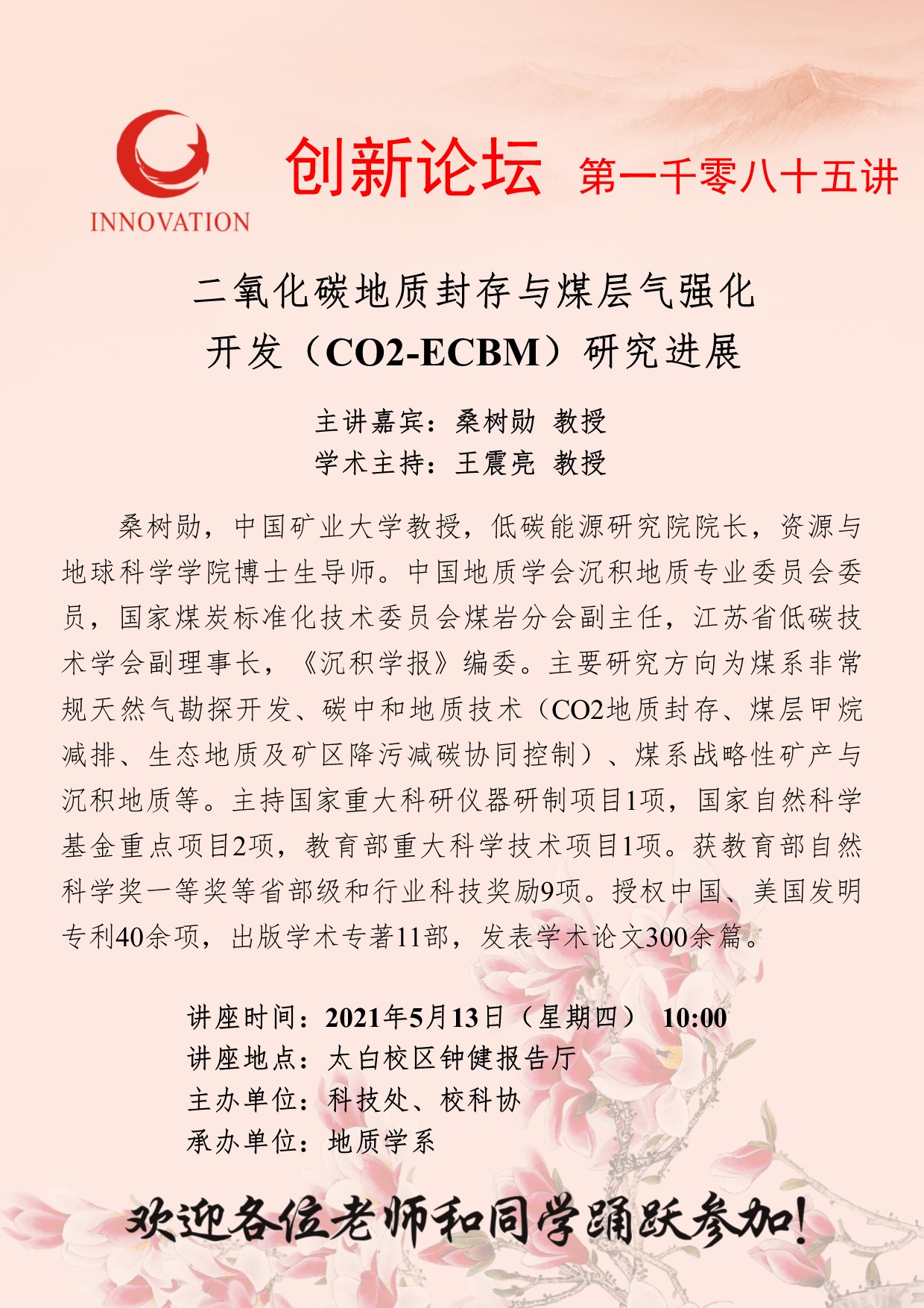 桑树勋 教授 欧冠官方网站创新论坛第一千零八十五讲:二氧化碳地质封存与煤层气强化开发(CO2-ECBM)研究进展 讲座时间 2021年5月13日(星期四) 10:00 讲座地点 太白校区钟健报告厅 讲座人介绍 桑树勋 教授 讲座内容