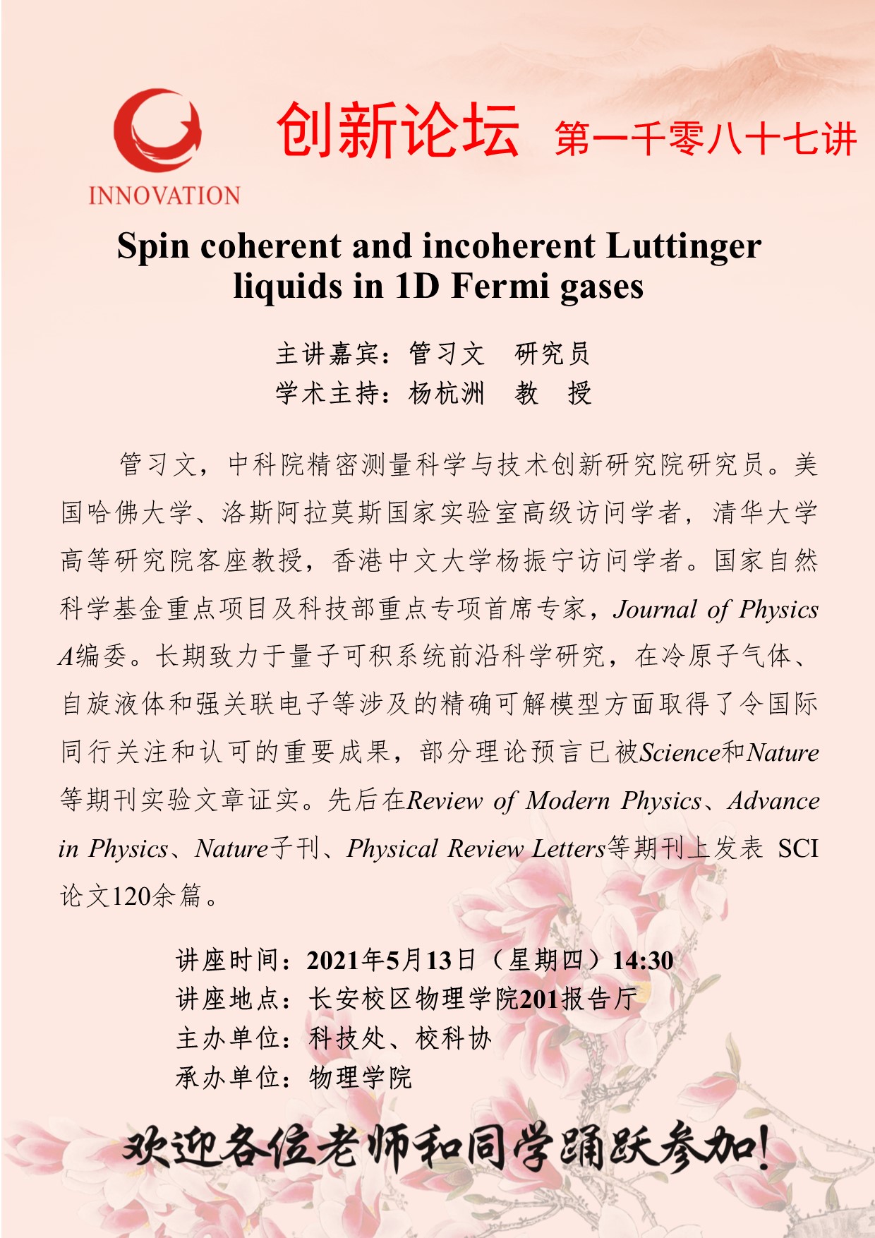 管习文 研究员 欧冠官方网站创新论坛第一千零八十七讲:Spin coherent and incoherent Luttinger liquids in 1D Fermi gases 讲座时间 2021年5月13日(星期四)14:30 讲座地点 长安校区物理学院201报告厅 讲座人介绍 管习文 研究员 讲座内容
