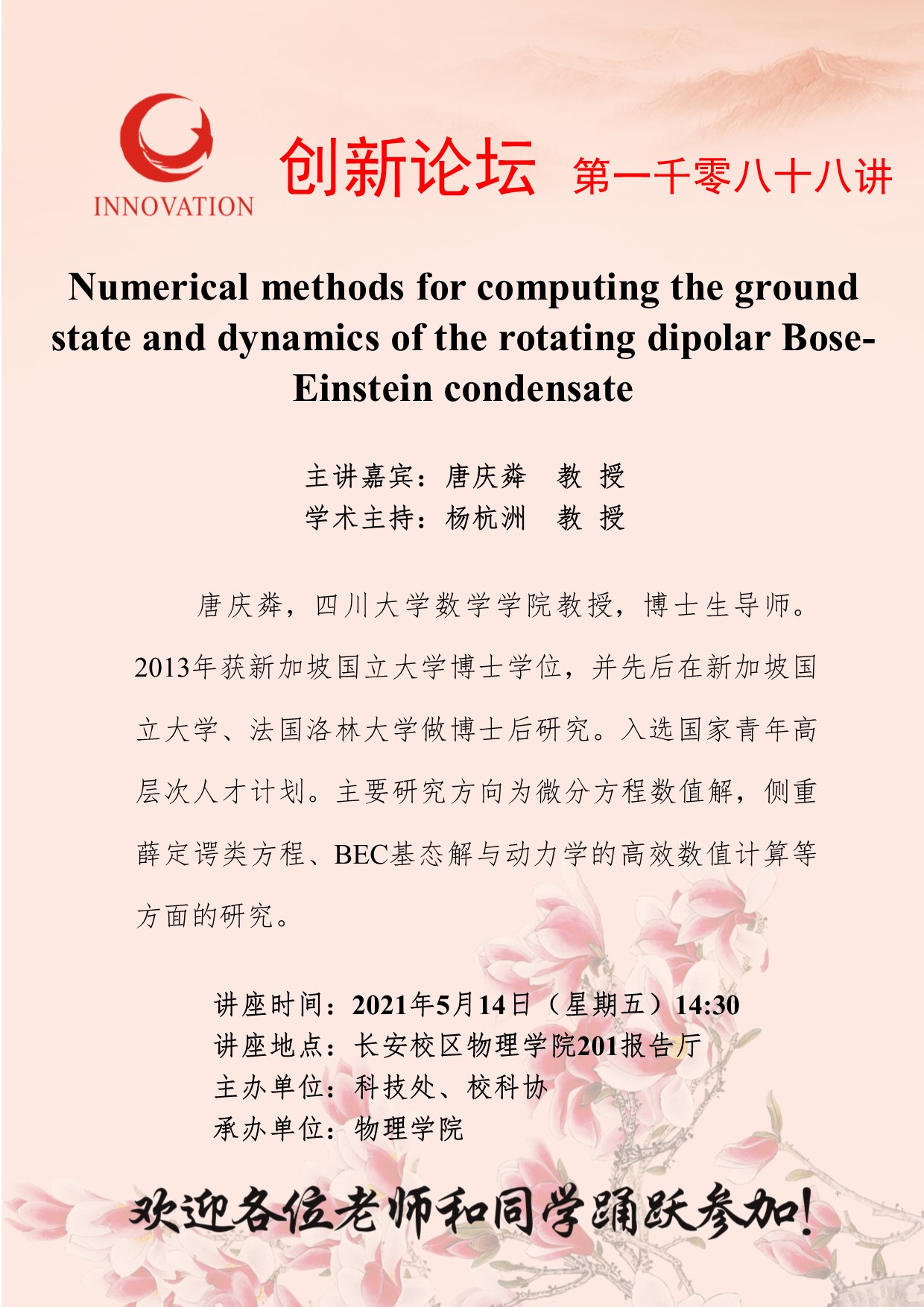 唐庆粦 教 授 欧冠官方网站创新论坛第一千零八十八讲:Numerical methods for computing the ground state and dynamics of the rotating dipolar Bose-Einstein condensate 讲座时间 2021年5月14日(星期五)14:30 讲座地点 长安校区物理学院201报告厅 讲座人介绍 唐庆粦 教 授 讲座内容