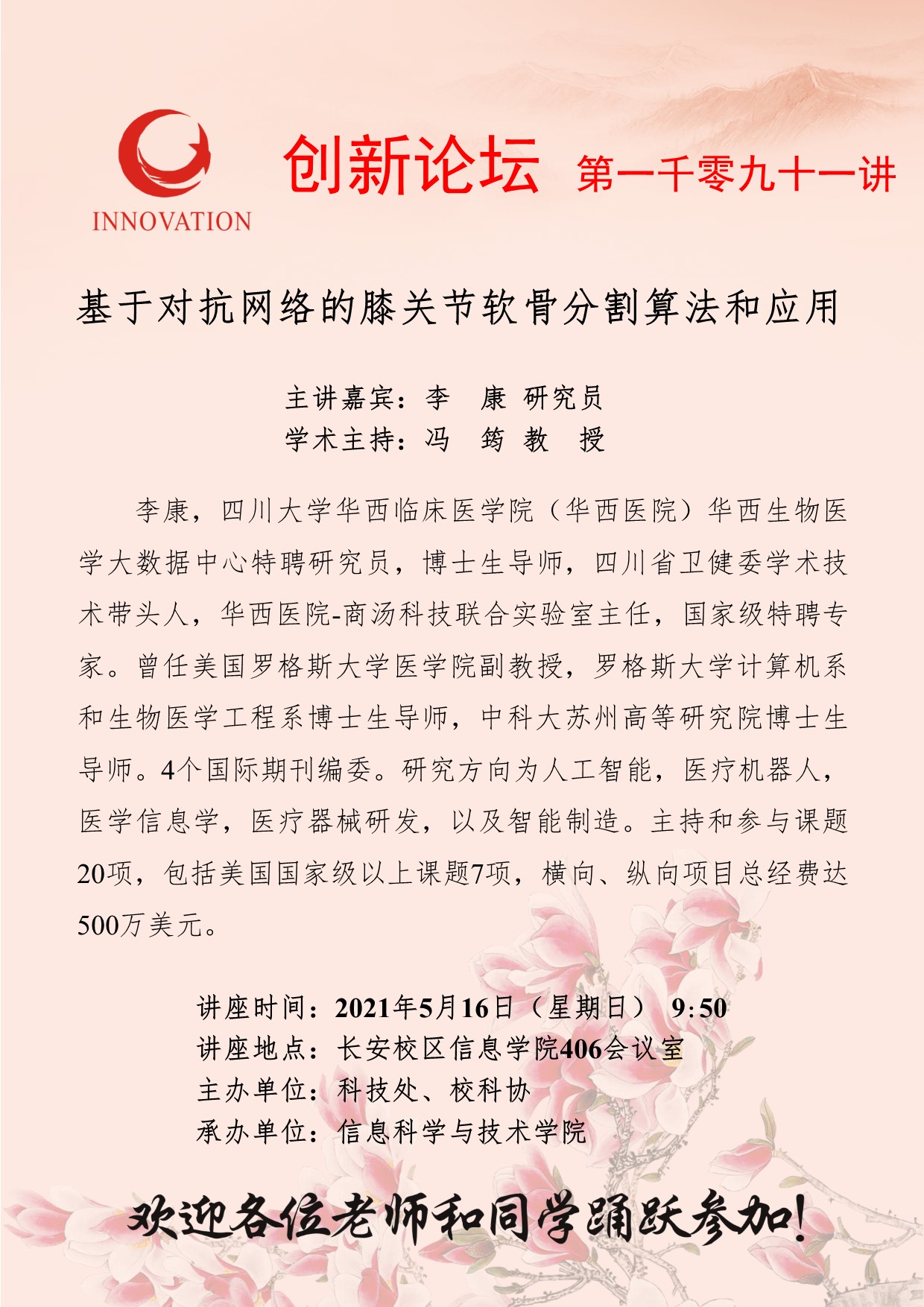李 康 研究员 欧冠官方网站创新论坛第一千零九十一讲:基于对抗网络的膝关节软骨分割算法和应用 讲座时间 2021年5月16日(星期日) 9:50 讲座地点 长安校区信息学院406会议室 讲座人介绍 李 康 研究员 讲座内容