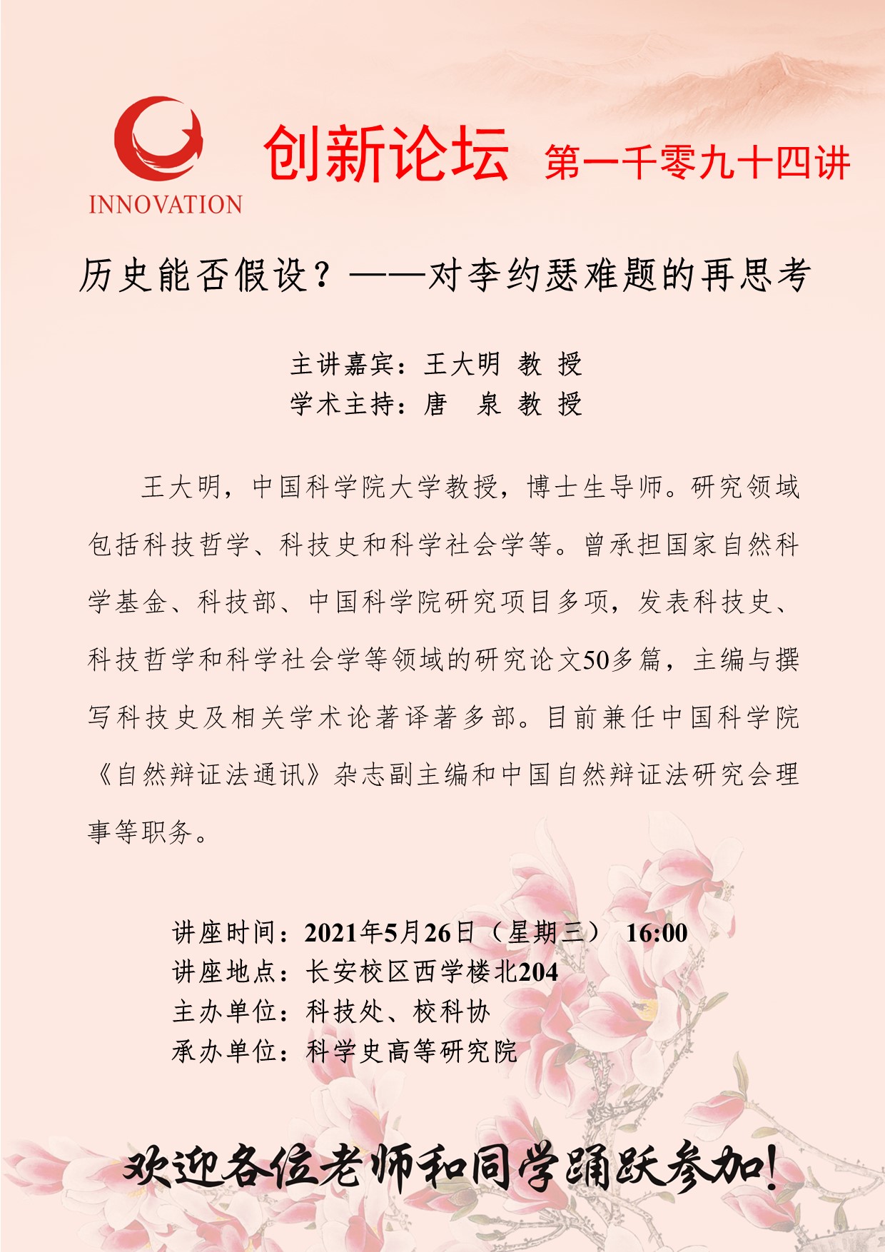 王大明 教 授 欧冠官方网站创新论坛第一千零九十四讲:历史能否假设?——对李约瑟难题的再思考 讲座时间 2021年5月26日(星期三) 16:00 讲座地点 长安校区西学楼北204 讲座人介绍 王大明 教 授 讲座内容
