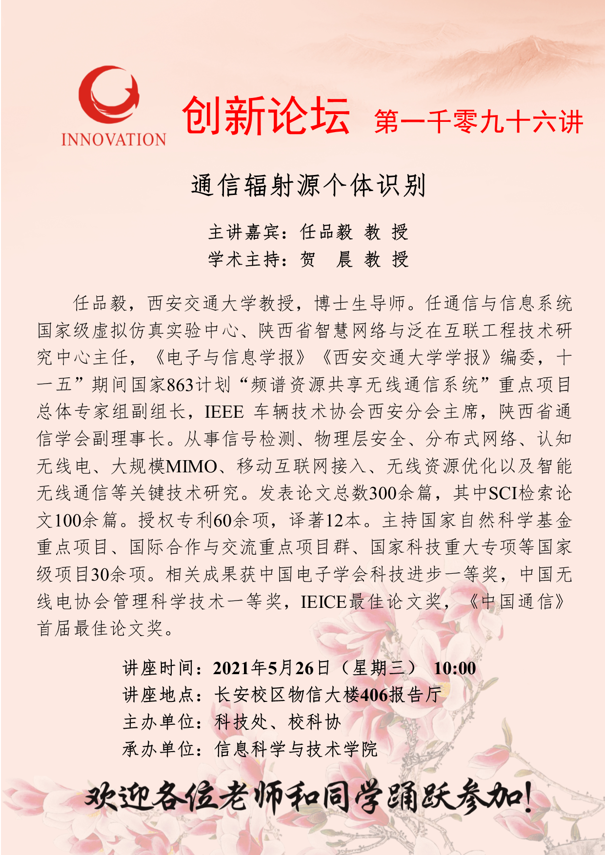 任品毅 教 授 欧冠官方网站创新论坛第一千零九十六讲:通信辐射源个体识别 讲座时间 2021年5月26日(星期三) 10:00 讲座地点 长安校区物信大楼406报告厅 讲座人介绍 任品毅 教 授 讲座内容