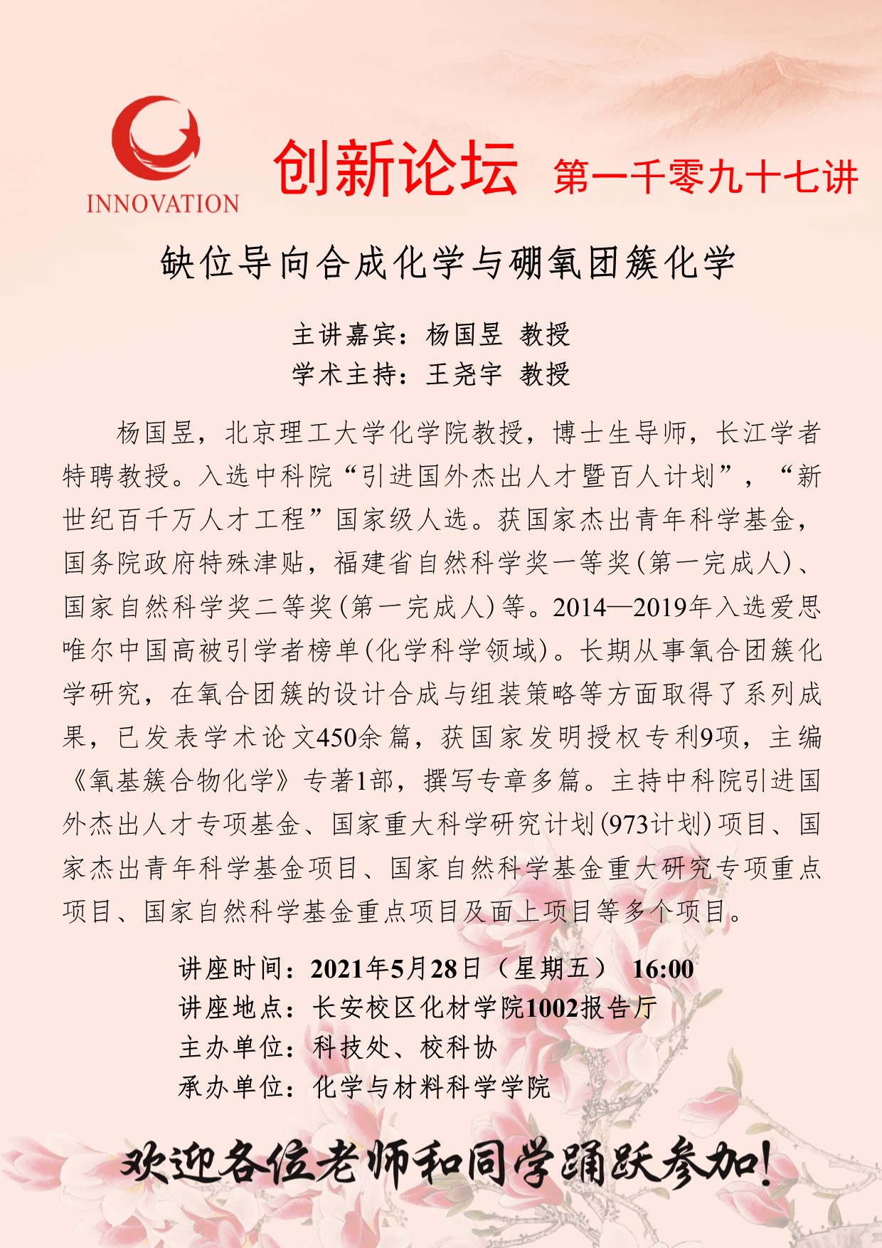 杨国昱 教授 欧冠官方网站创新论坛第一千零九十七讲:缺位导向合成化学与硼氧团簇化学 讲座时间 2021年5月28日(星期五) 16:00 讲座地点 长安校区化材学院1002报告厅 讲座人介绍 杨国昱 教授 讲座内容