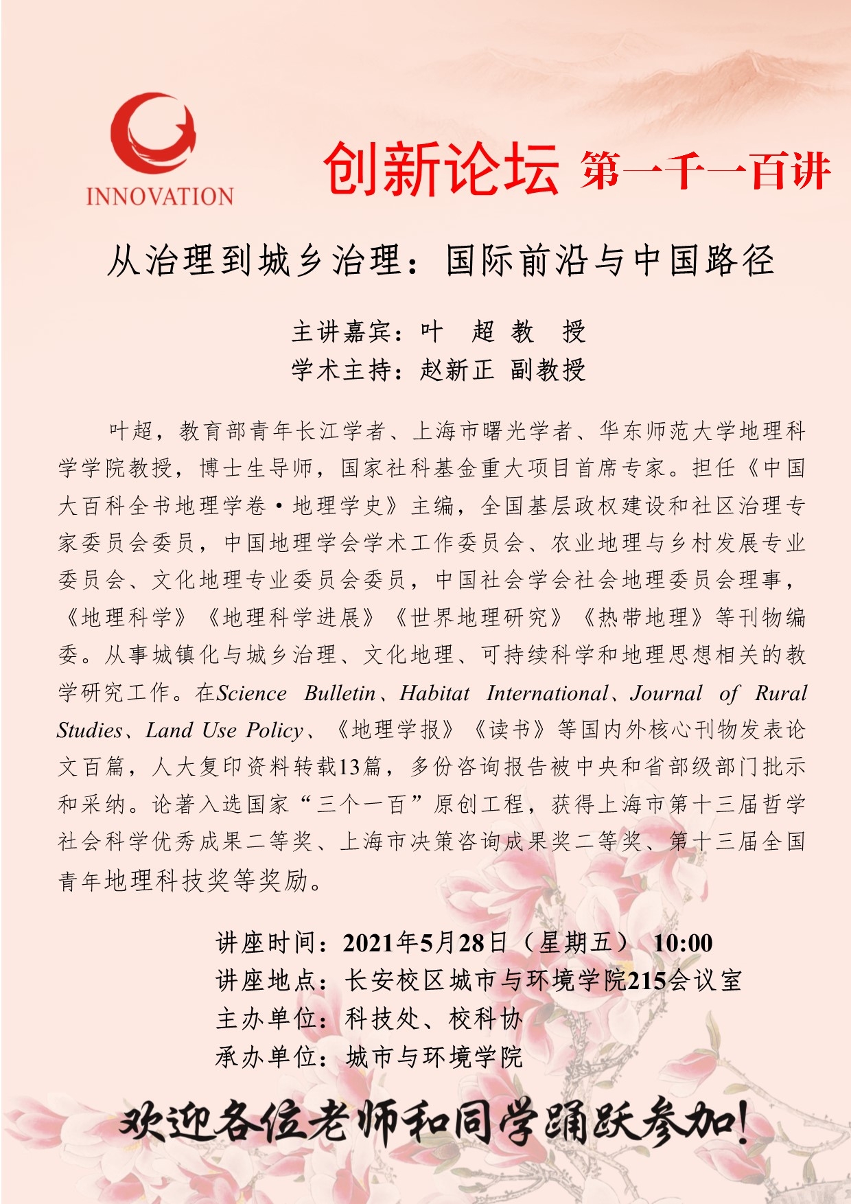 叶超 教授 欧冠官方网站创新论坛第一千一百讲:从治理到城乡治理:国际前沿与中国路径 讲座时间 2021年5月28日(星期五)10:00 讲座地点 长安校区城市与环境学院215会议室 讲座人介绍 叶超 教授 讲座内容