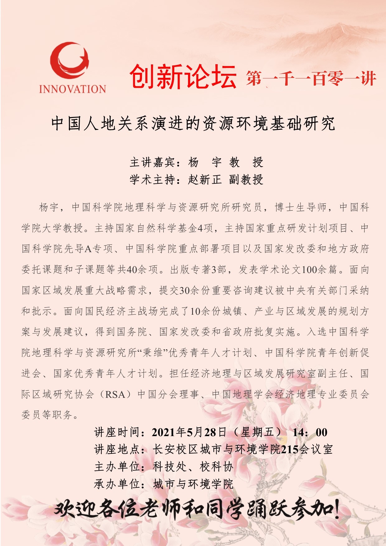 杨宇 教授 欧冠官方网站创新论坛第一千一百零一讲:中国人地关系演进的资源环境基础研究 讲座时间 2021年5月28日(星期五)14:00 讲座地点 长安校区城市与环境学院215会议室 讲座人介绍 杨宇 教授 讲座内容