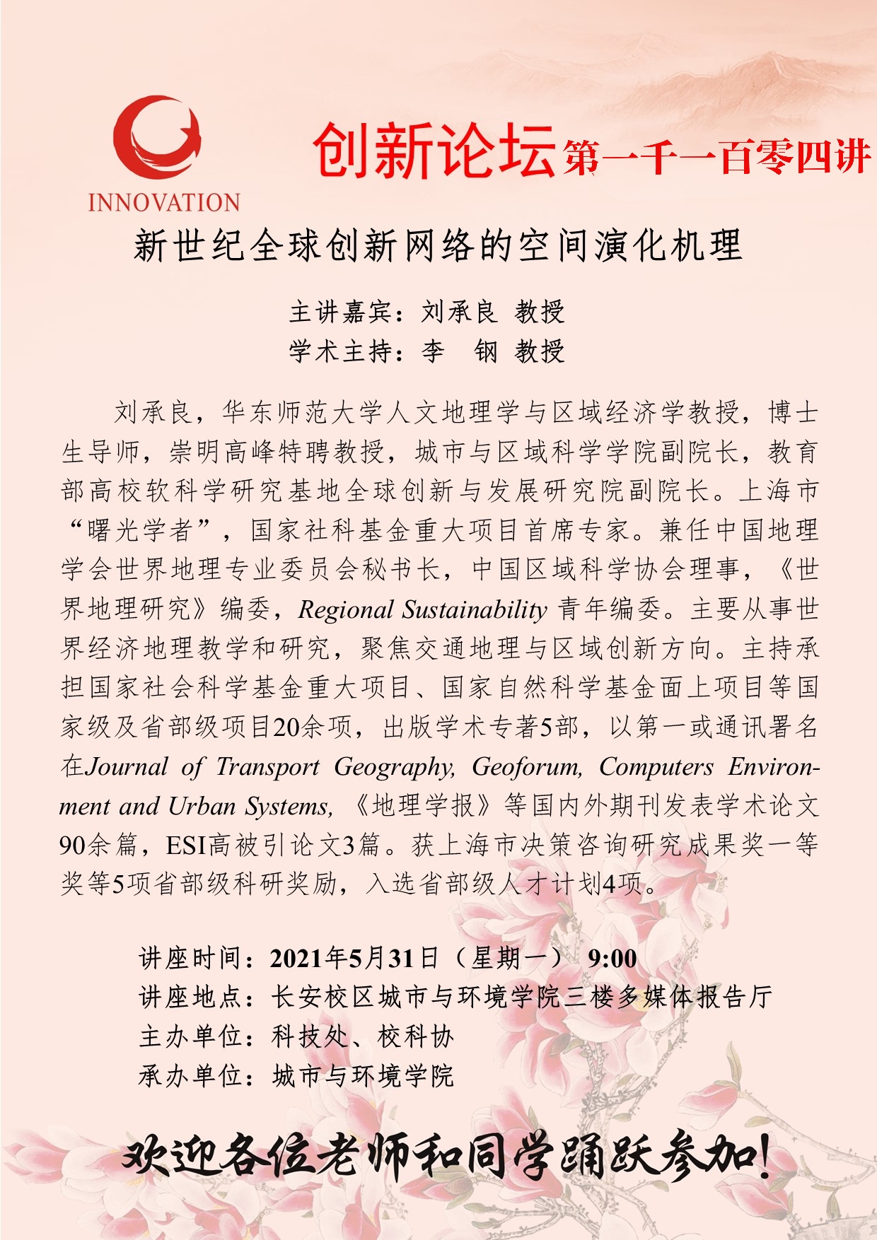 刘承良 教授 欧冠官方网站创新论坛第一千一百零四讲:新世纪全球创新网络的空间演化机理 讲座时间 2021年5月31日(星期一) 9:00 讲座地点 长安校区城市与环境学院三楼多媒体报告厅 讲座人介绍 刘承良 教授 讲座内容