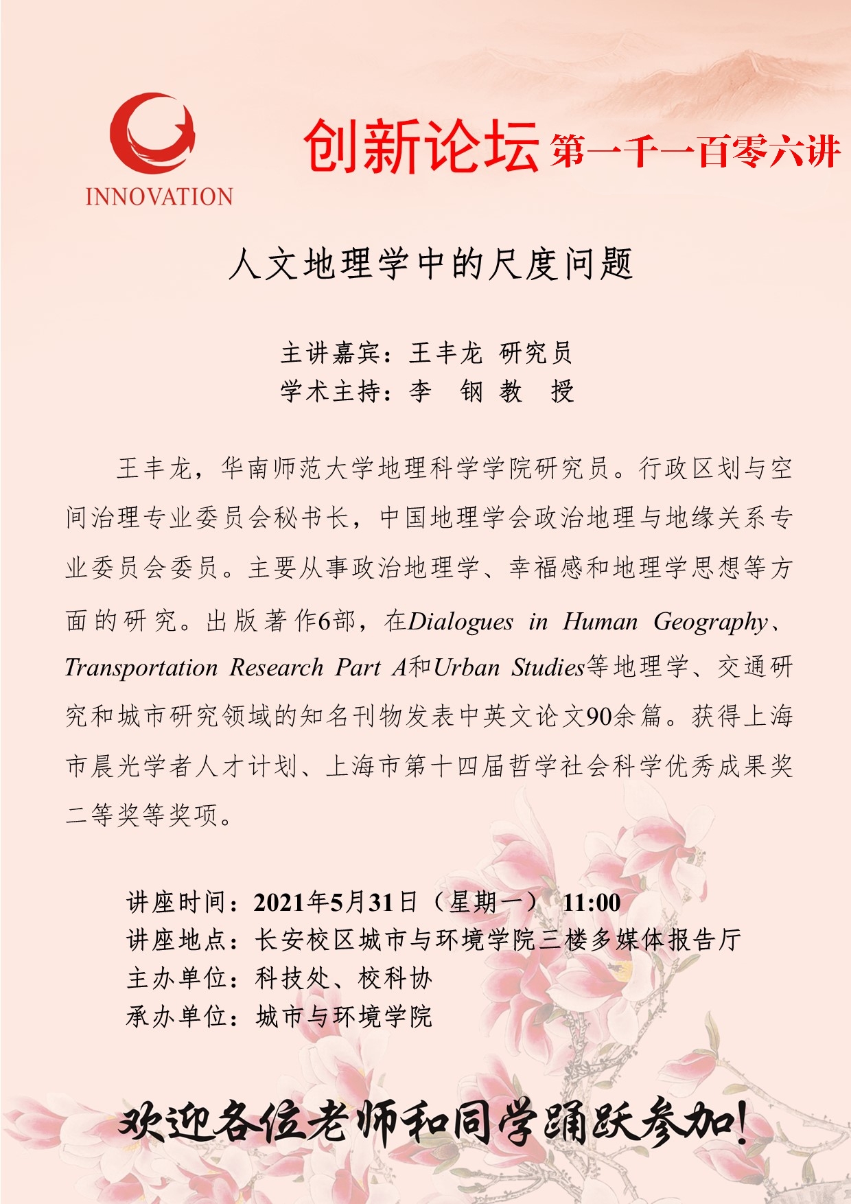 王丰龙 研究员 欧冠官方网站创新论坛第一千一百零六讲:人文地理学中的尺度问题 讲座时间 2021年5月31日(星期一) 11:00 讲座地点 长安校区城市与环境学院三楼多媒体报告厅 讲座人介绍 王丰龙 研究员 讲座内容