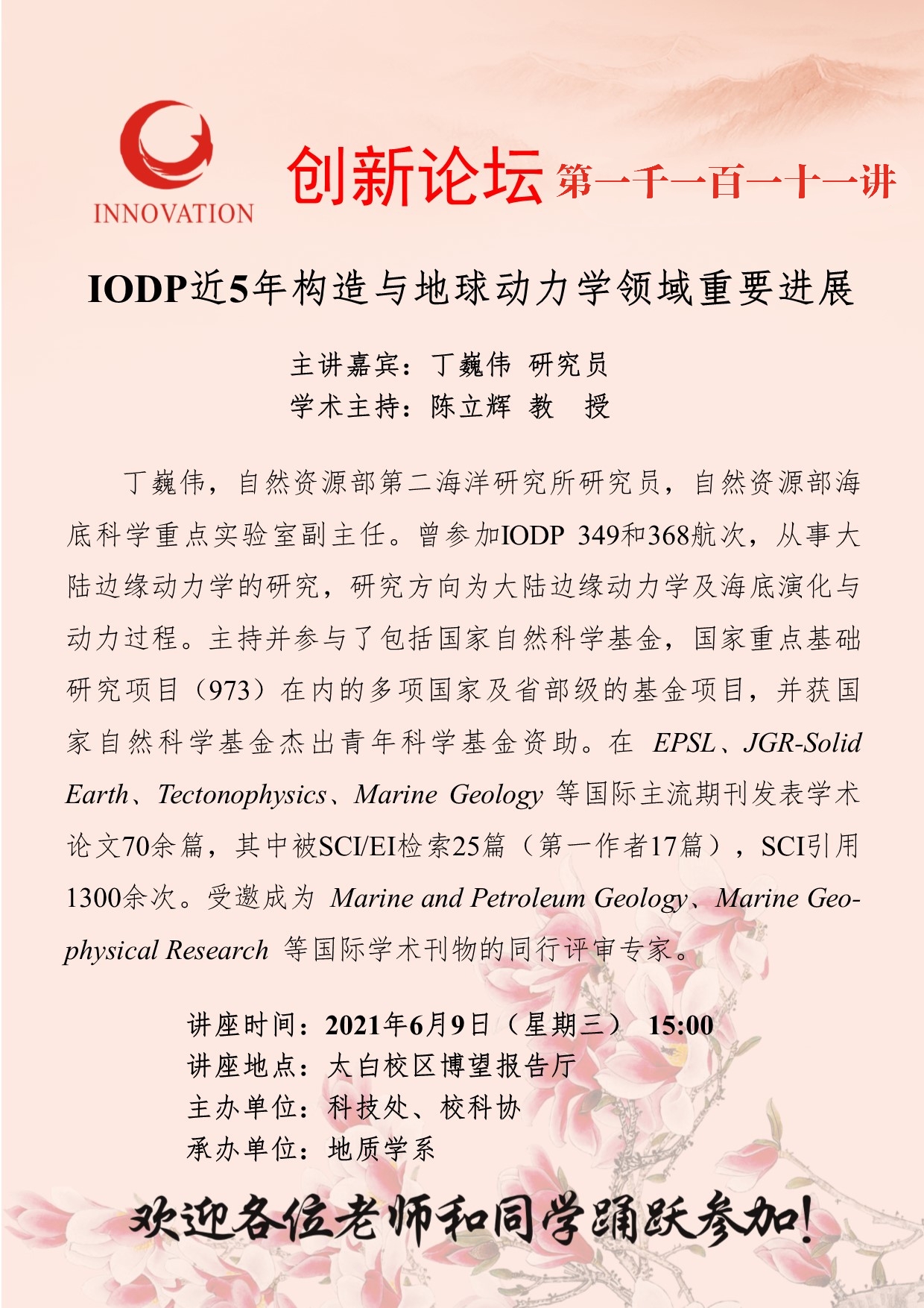 丁巍伟 研究员 欧冠官方网站创新论坛第一千一百一十一讲:IODP近5年构造与地球动力学领域重要进展 讲座时间 2021年6月9日(星期三) 15:00 讲座地点 太白校区博望报告厅 讲座人介绍 丁巍伟 研究员 讲座内容