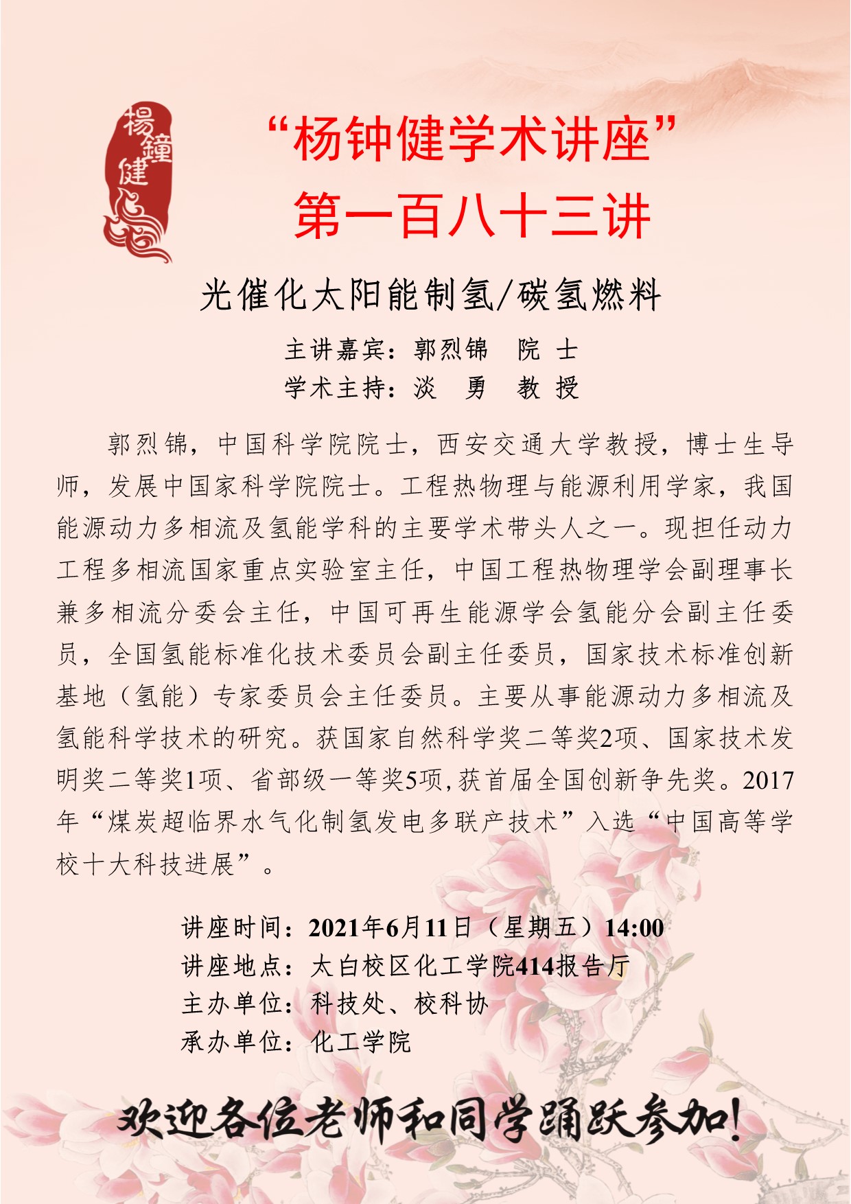 “杨钟健学术讲座”第一百八十三讲:光催化太阳能制氢/碳氢燃料