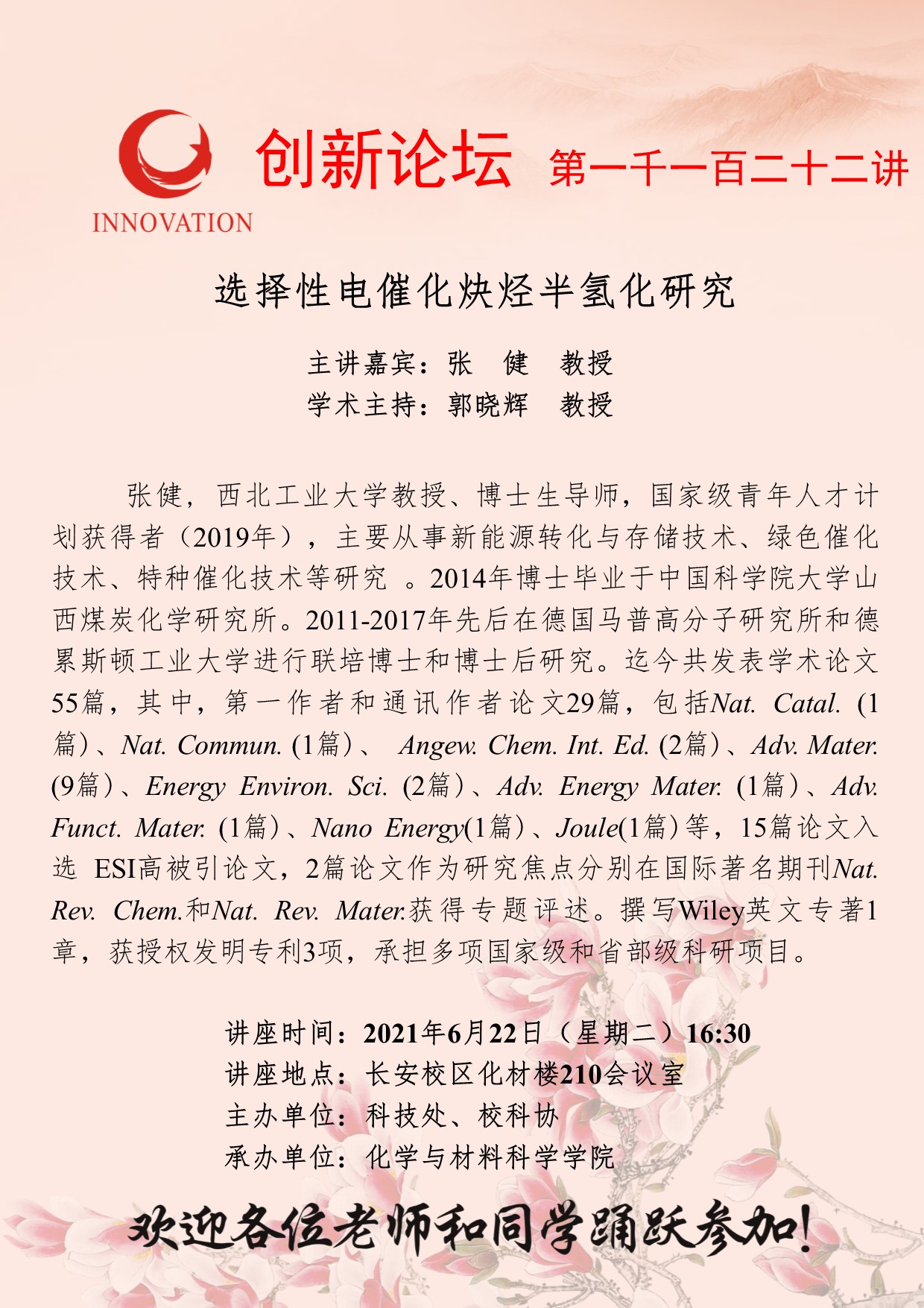 张 健 教授 欧冠官方网站创新论坛第一千一百二十二讲:选择性电催化炔烃半氢化研究 讲座时间 2021年6月22日(星期二)16:30 讲座地点 长安校区化材楼210会议室 讲座人介绍 张 健 教授 讲座内容
