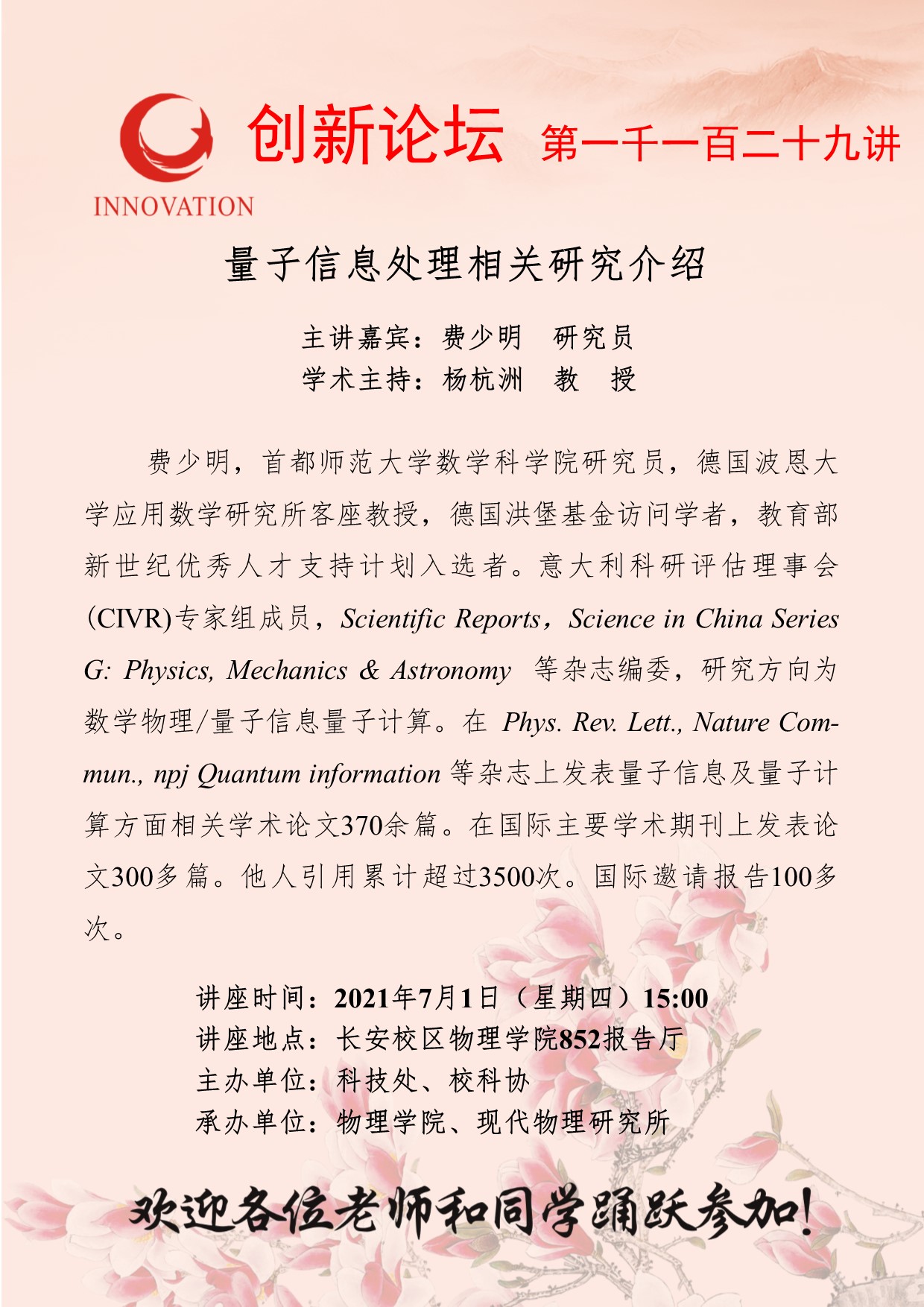 费少明 研究员 欧冠官方网站创新论坛第一千一百二十九讲:量子信息处理相关研究介绍 讲座时间 2021年7月1日(星期四)15:00 讲座地点 长安校区物理学院852报告厅 讲座人介绍 费少明 研究员 讲座内容