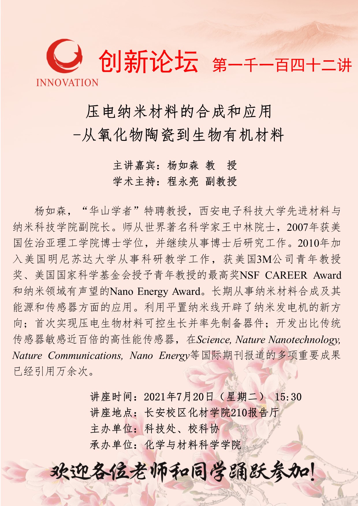 杨如森 教授 欧冠官方网站创新论坛第一千一百四十二讲:压电纳米材料的合成和应用-从氧化物陶瓷到生物有机材料 讲座时间 2021年7月20日(星期二) 15:30 讲座地点 长安校区化材学院210报告厅 讲座人介绍 杨如森 教授 讲座内容