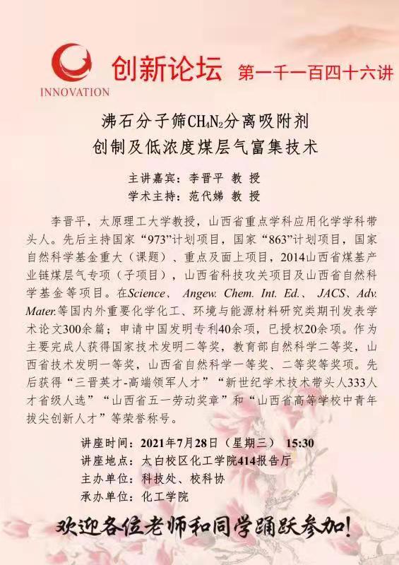 创新论坛第一千一百四十六讲:沸石分子筛CH4N2分离吸附剂创制及低浓度煤层气富集技术