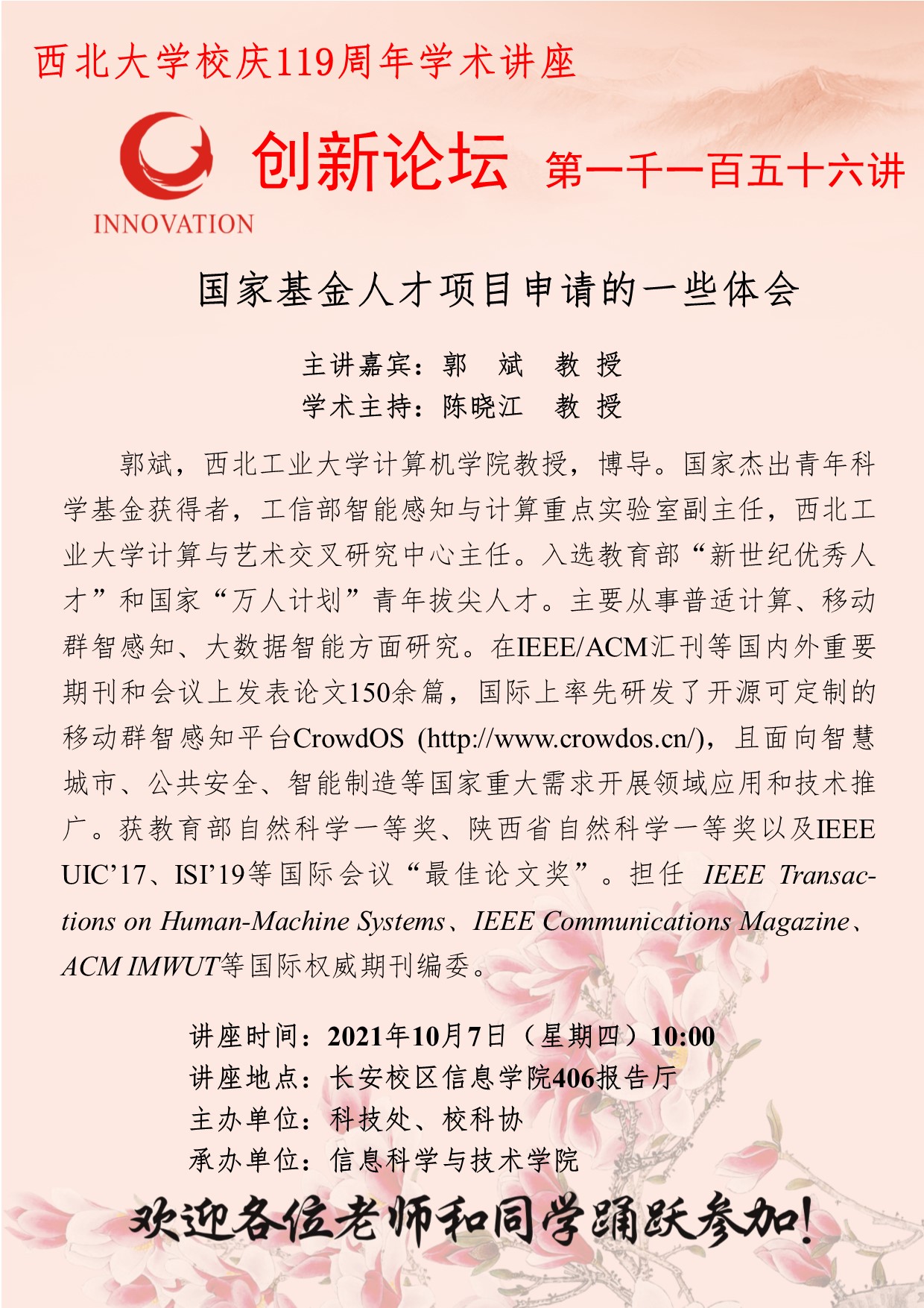 郭斌 教授 欧冠官方网站创新论坛第一千一百五十六讲暨校庆119周年学术讲座: 国家基金人才项目申请的一些体会 讲座时间 2021年10月7日(星期四)10:00 讲座地点 长安校区信息学院406报告厅 讲座人介绍 郭斌 教授 讲座内容