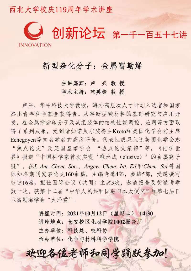 卢兴 教授 欧冠官方网站创新论坛第一千一百五十七讲暨校庆119周年学术讲座: 新型杂化分子:金属富勒烯 讲座时间 2021年10月12日(星期二)14:30 讲座地点 长安校区化材学院1002报告厅 讲座人介绍 卢兴 教授 讲座内容