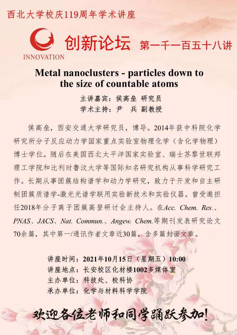 侯高垒 研究员 欧冠官方网站创新论坛第一千一百五十八讲暨校庆119周年学术讲座: Metal nanoclusters - particles down to the size of countable atoms 讲座时间 2021年10月15日(星期五)10:00 讲座地点 长安校区化材楼1002多媒体室 讲座人介绍 侯高垒 研究员 讲座内容