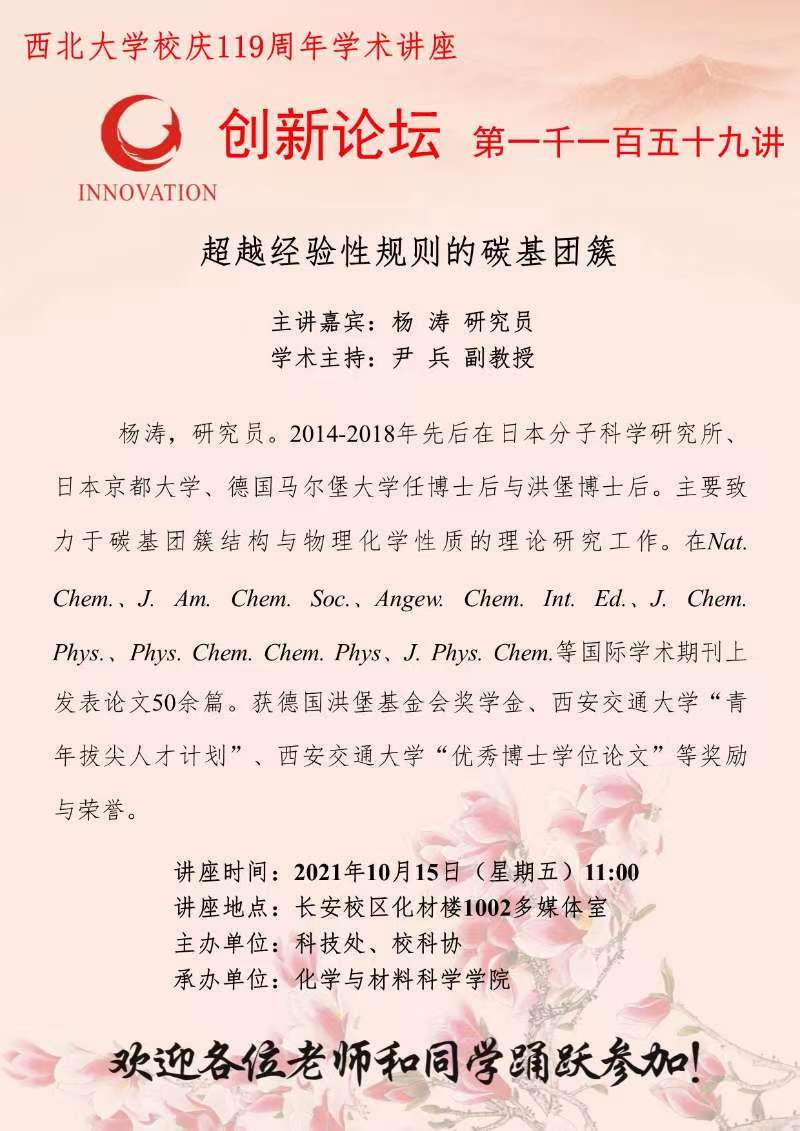 杨涛 研究员 欧冠官方网站创新论坛第一千一百五十九讲暨校庆119周年学术讲座:超越经验性规则的碳基团簇 讲座时间 2021年10月15日(星期五)11:00 讲座地点 长安校区化材楼1002多媒体室 讲座人介绍 杨涛 研究员 讲座内容